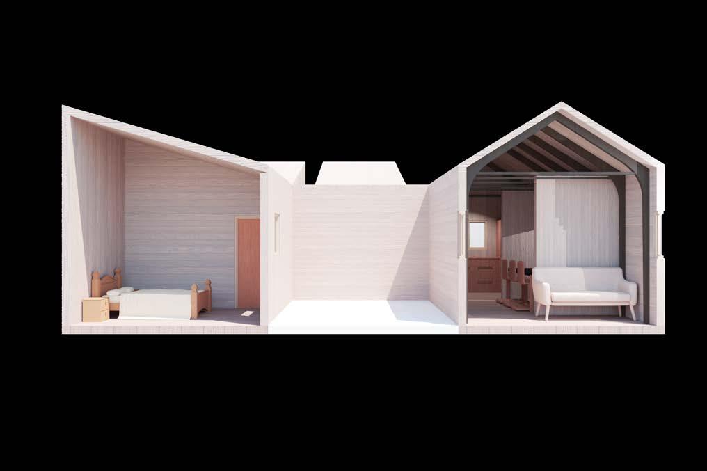 With regards to the building assembly, the roof, wall, and floor evolved to be made up of four layers of 2x4s that are Lignoloced together. The wall panels, specifically, use a simplified to a variation of a tongue-and-groove joint where each panel facilitated a slot for a 2x4 to be inserted and fastened panels together. The exterior facing side of the wall panel is coated with a mineral layer made up of clay and lime that is then attached to the exterior cladding with battens to create an air barrier. The exterior cladding, along with some structural members, is fire-treated to improve its rot and insect resistance. The interior of the wall panels is finished with lime to further improve the resistance of the wood and add to the aesthetic value as one interacts with the exterior and interior.
