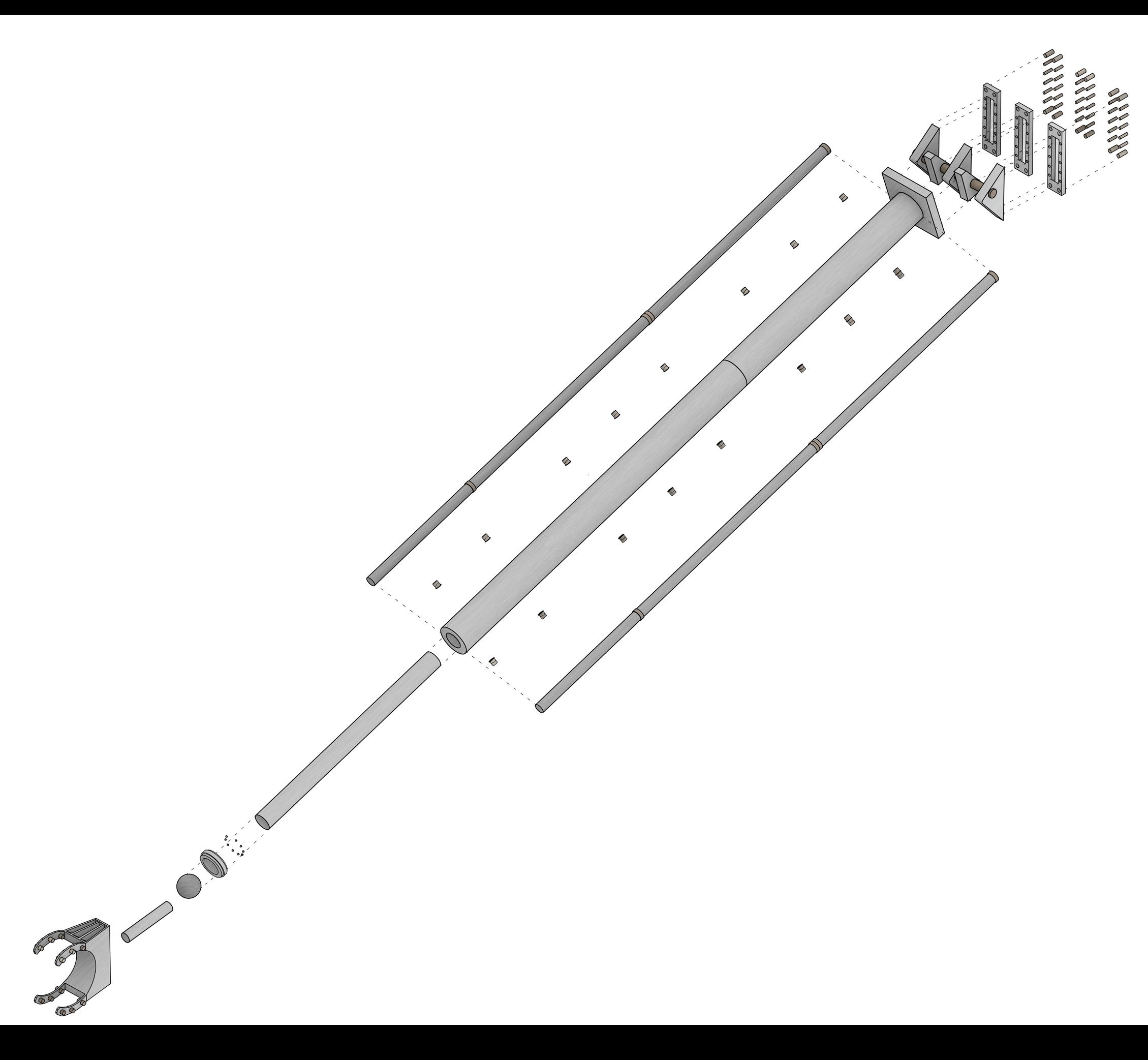The structure’s components (Arch and Fins) move through its main kinetic system of a hydraulic actuator. The hydraulic actuator is suspended from the ceiling of the pavilion and is connected to the arch in its lowered resting state. In a contracted state, the actuator keeps the arch lowered which in turn keeps the fins lowered. However, Once the actuator extends, it pushes the arch outwards which in turn lifts and raises the fins.