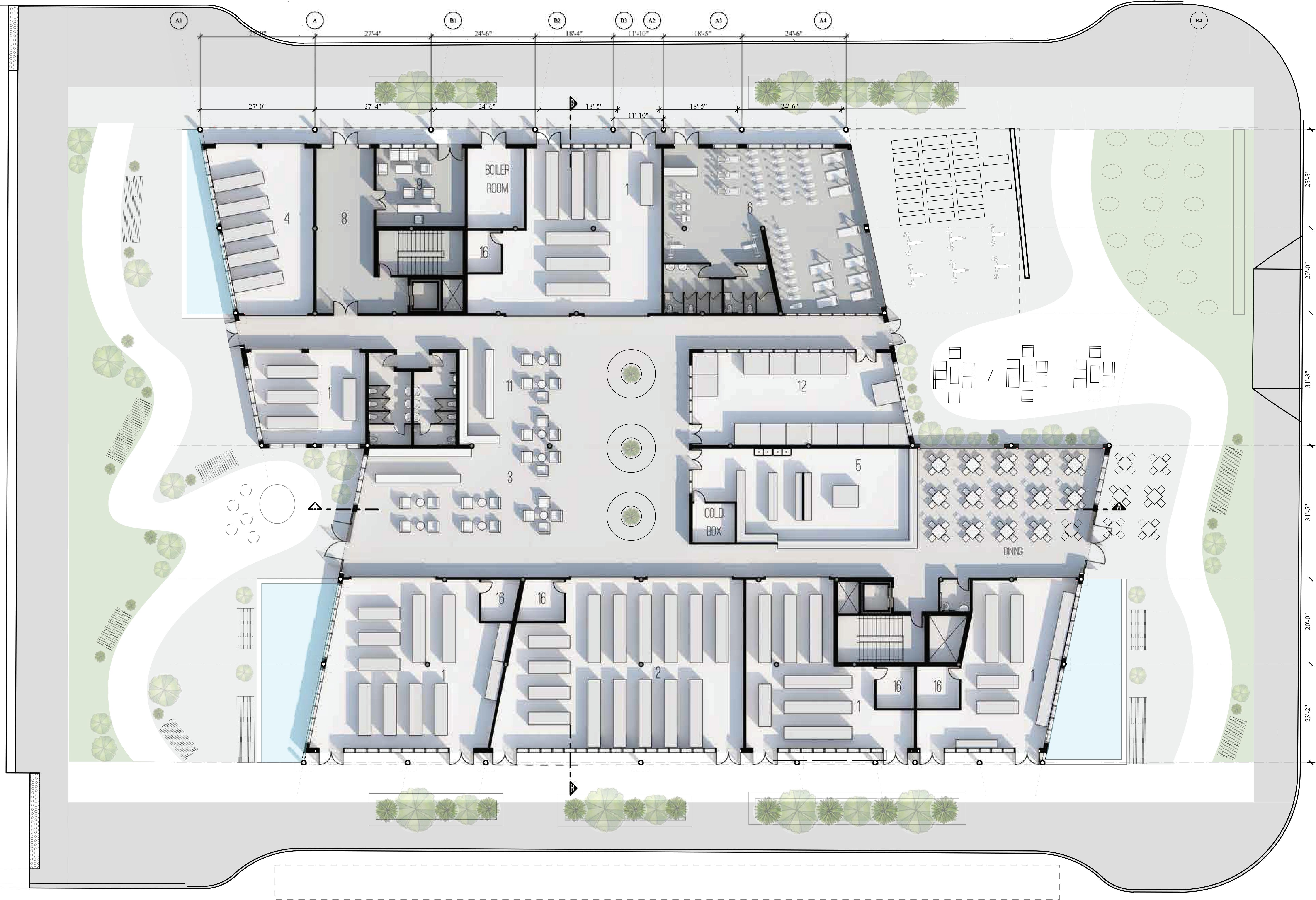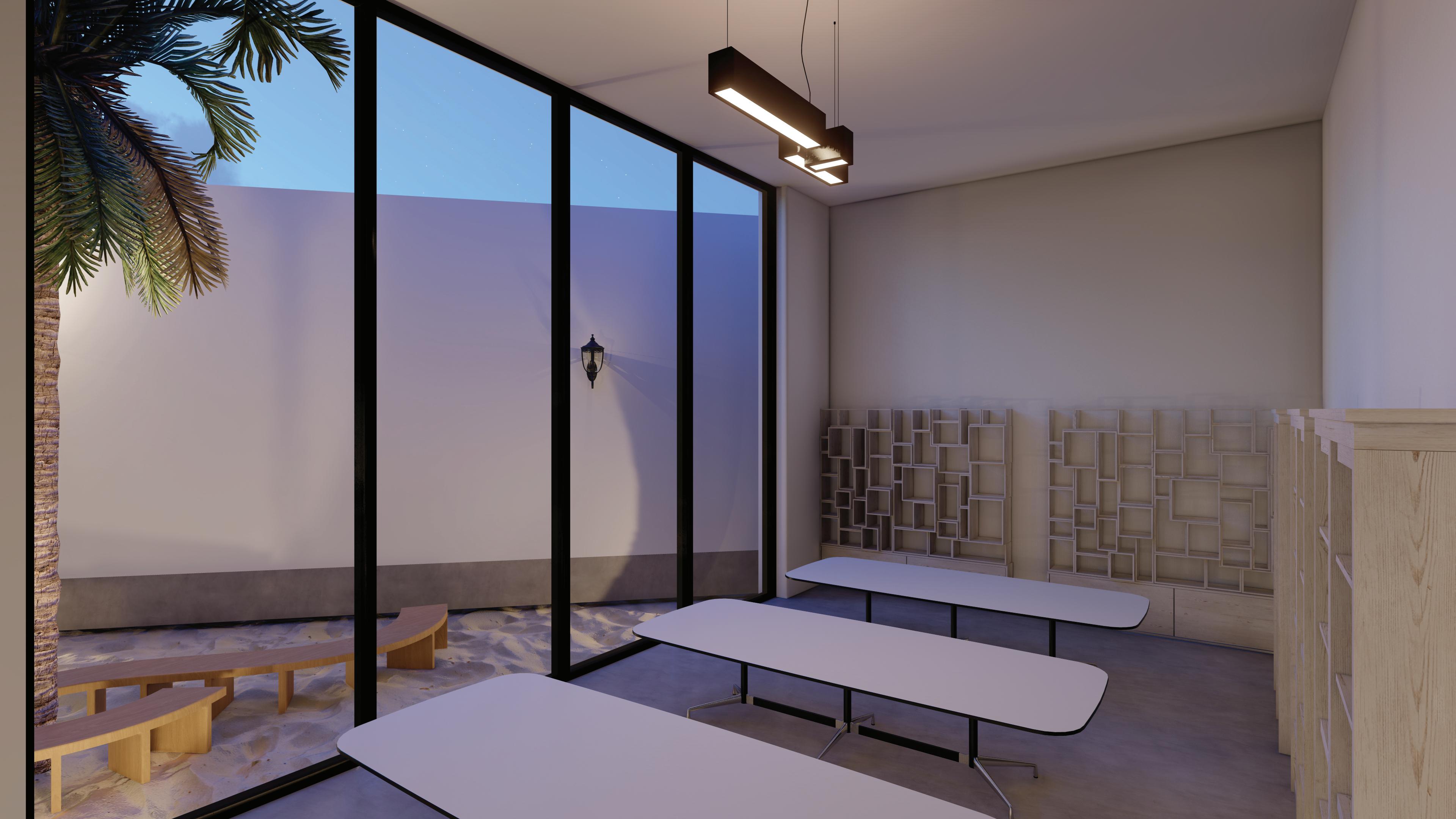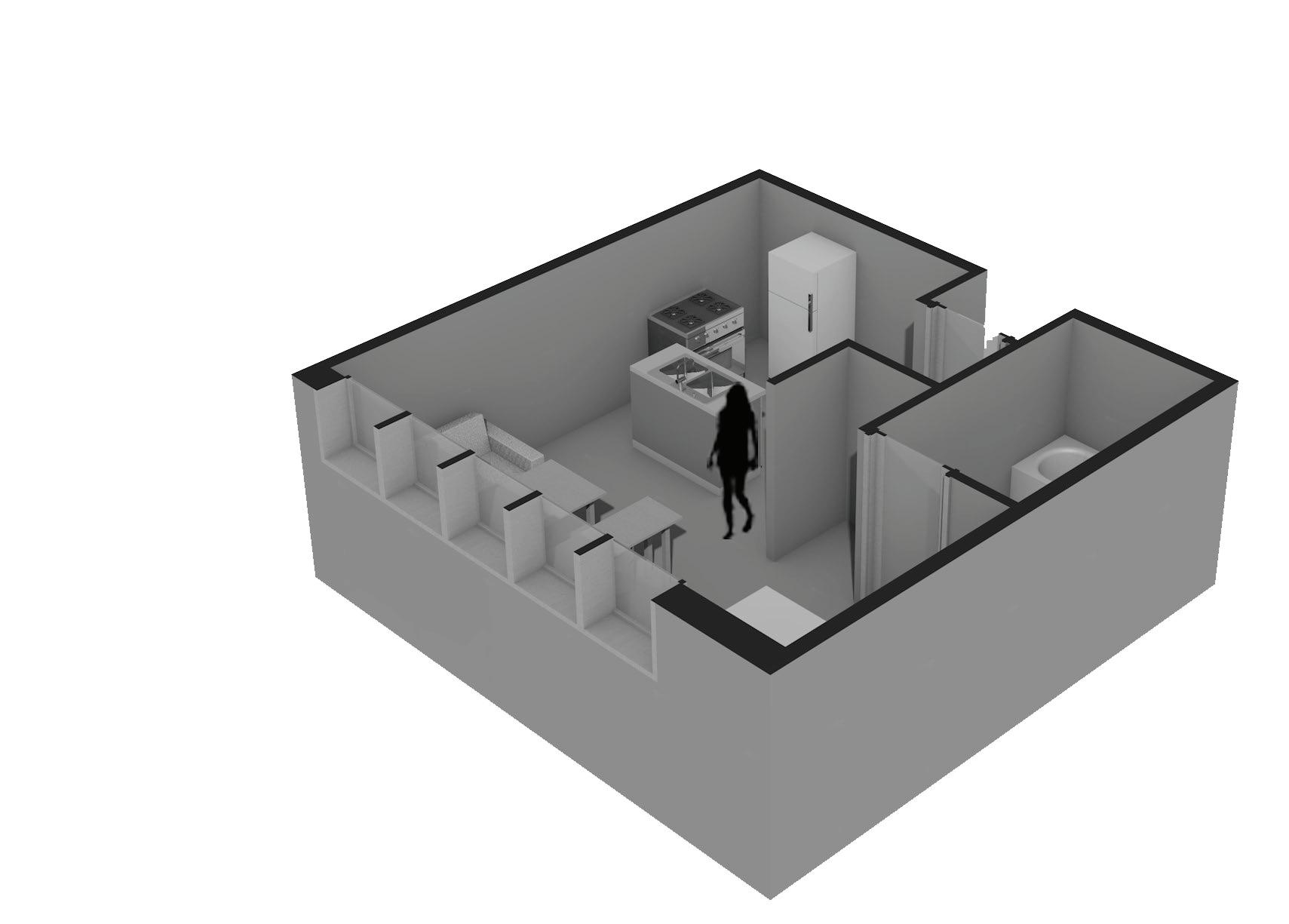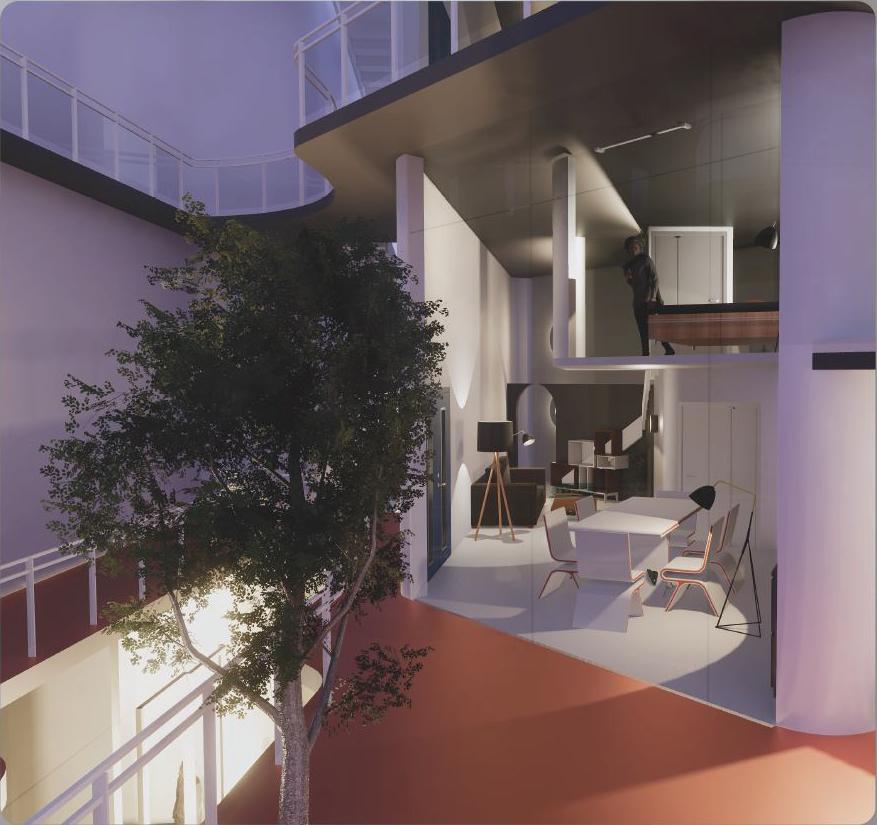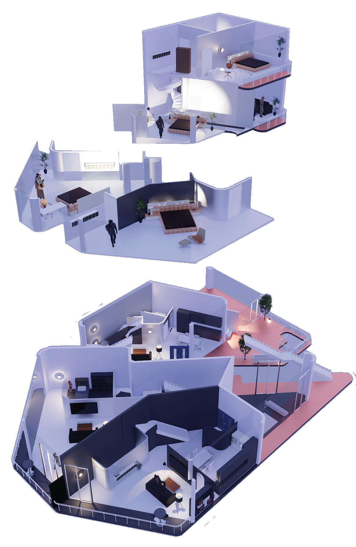 Interior spaces are shaped by the core concept while responding to users' needs and optimizing spatial use. The design aims to foster a sense of security and comfort throughout the building experience. The circulation is efficient, and the universal design principles are prioritized to ensure accessibility and inclusivity, all while maintaining the off-grid-niche approach to sustainable and community-driven living.