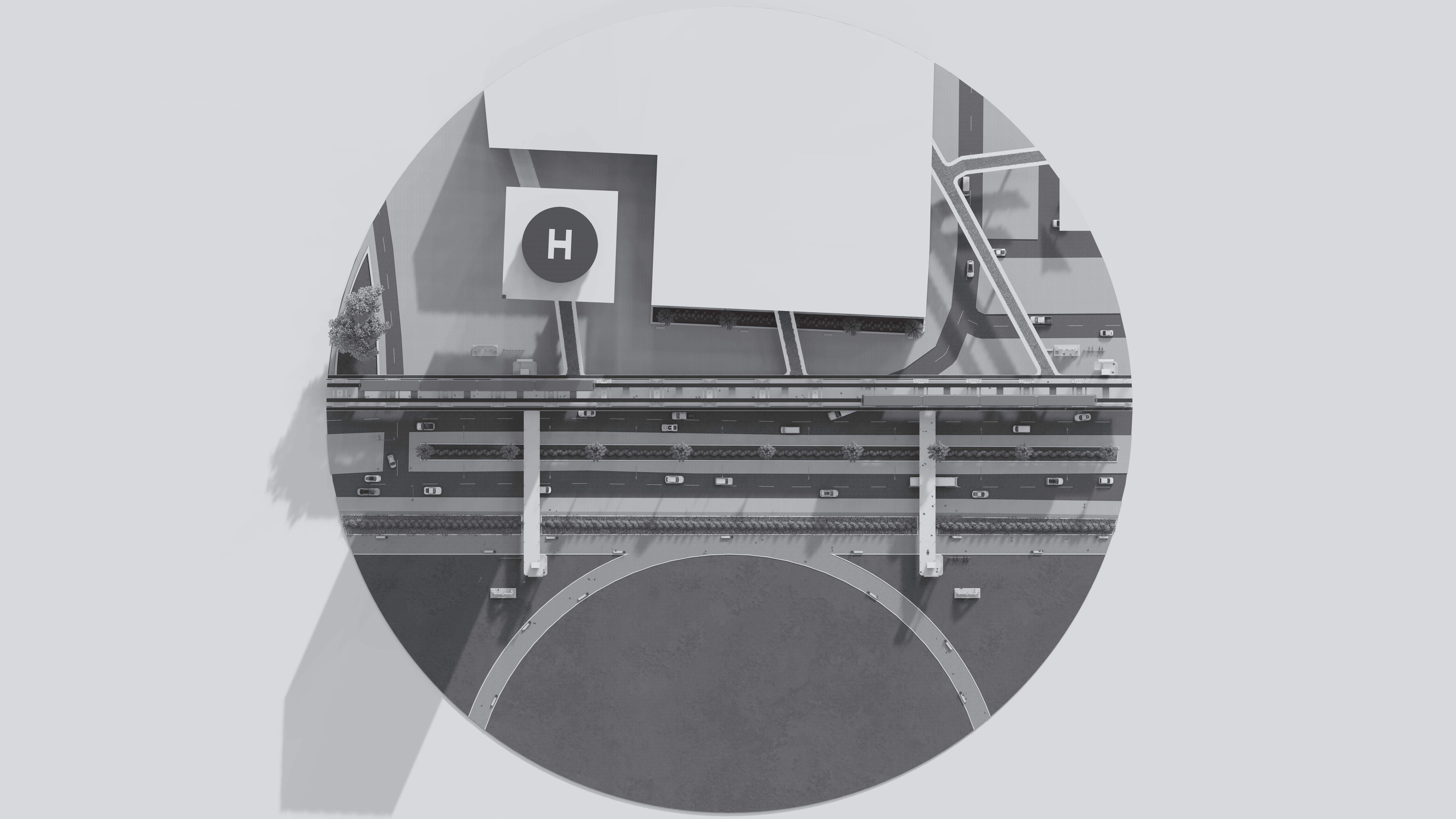 An exploded section drawing of the pathways illustrates the structure and design of the project in relation to the pedestrians and the numerous means of transportation. A set of close-up renders illustrates the details of the site.