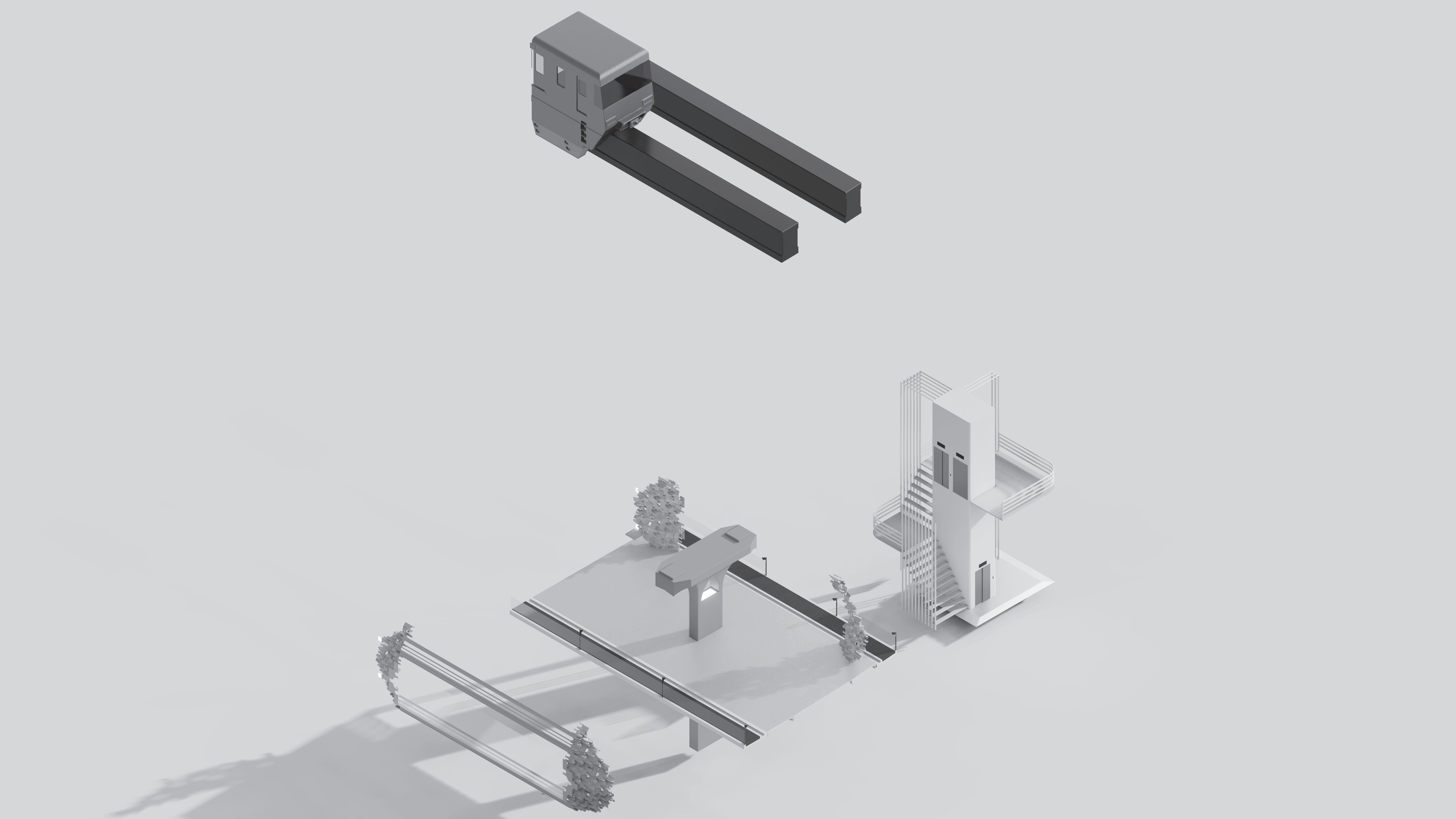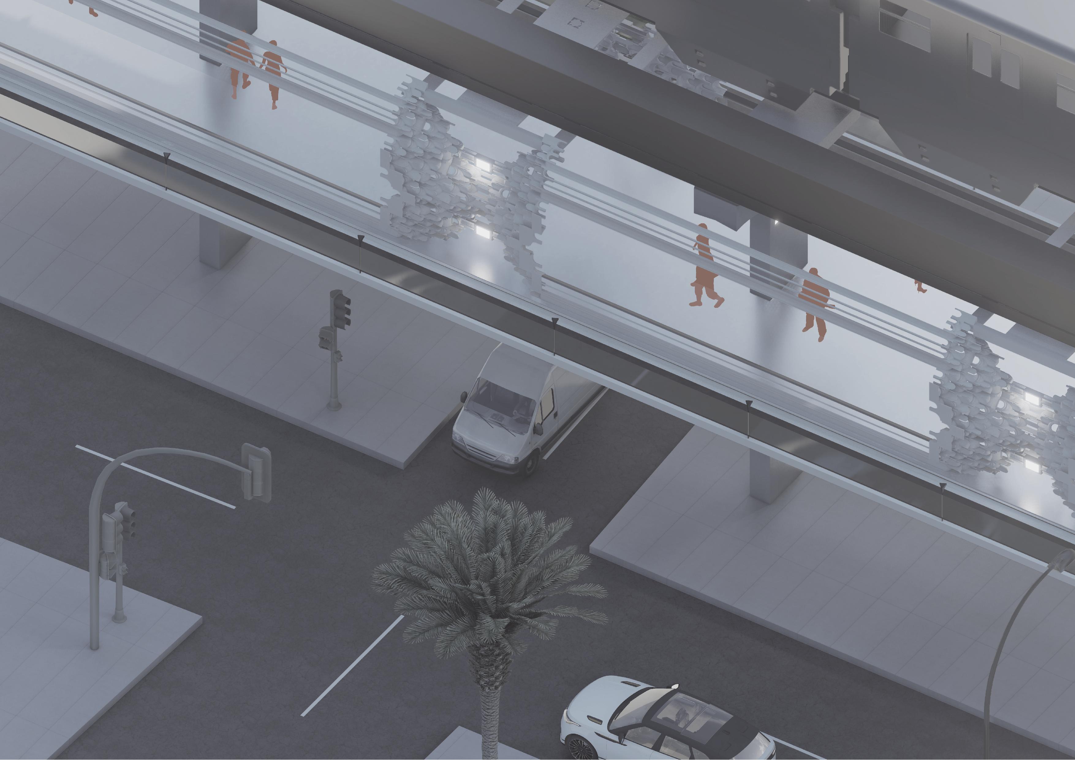 Wasil is located at the Shamiya Gate Station, bridging pedestrians from the tram station to all the existing, built environ ments. The pathways are constructed to be elevated and they vary in scale depending on the human density and the tramline locations. Wide elevated walkways are established under the tram line to grant easy access to the tram transportation system, which also includes bicycle lanes to allow and raise awareness of different means of transportation. Narrow elevated walkways weave through the built environment to allow easy and direct transitions from one building to another. Multiple strategically positioned staircases and elevators are placed to guide pedestrians from the ground level to the elevated walkways and to the tram. Other amenities such as tram ticket vendors, washrooms, bike racks, benches, etc., are also included.