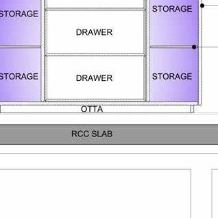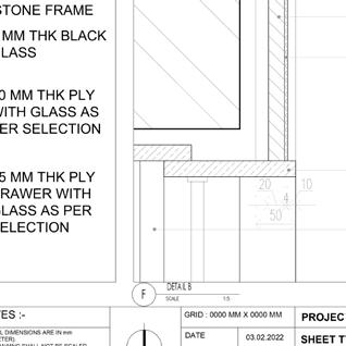 W8 2000 750 600 600 600 600 600 600 600 MM DEPTH 30 MM THK CARARRA MARBLE 250 450 350 250 1830 1840 620 650 1040 5000 2450 600 MM DEPTH 30 MM THK CARARRA MARBLE 20 MM THK INT.PLASTER 30 MM THK WALL MOUNTED SHELVE 25 MM THK EXT.PLASTER PLAN @1200 MM SCALE1:25 0m 0.5m 1m 3m KITCHEN PLAN @1200 150 MM THK PCC SLAB 38 MM THK SCREEDING 450 MM THK RCC BEAM 30 MM THK CARARRA MARBLE 18 MM THK KADAPPA -ONE SIDE SMOOTH 500 MM HT UPPER CABINETS 230 MM THK BRICK WALL 20 MM THK MARBLE 20 MM THK WALL MOUNTED MARBLE SHELVE OVEN 800 205 1025 110 565 535 3300 5000 300 300 300 370 390 195 175 615 0m 0.5m 1m 3m SECTION AA A A 230 MM THK BRICK WALL 12 MM THK INTERNAL BACKING 20 MM THK CEMENT MORTAR 10 MM THK TILE 18 MM THK KADAPPA 18 MM MORTAR 75 50 DETAIL D 40 50 230 MM THK BRICK WALL 12 MM THK INTERNAL BACKING 20 MM THK CEMENT MORTAR PLYWOOD PACKING PIECE STEEL SECTION 18 MM THK KADAPPA 10 MM THK TILE DETAIL B ARALDITE ADDHESIVE 70 50 230 MM THK BRICK WALL 12 MM THK INTERNAL BACKING 20 MM THK CEMENT MORTAR 18 MM THK KADAPPA 10 MM THK TILE ARALDITE ADDHESIVE DETAIL C DETAIL A DETAIL B DETAIL C