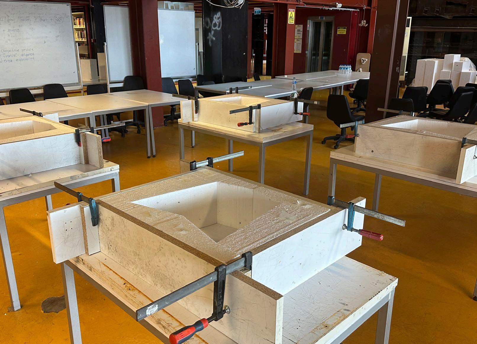 Various mixtures were tested, incorporating proportions of earth, lime, gypsum, pellets, and water. Material samples were assessed for their consistency, structural strength, and drying characteristics, ensuring suitability for robotic earth construction.