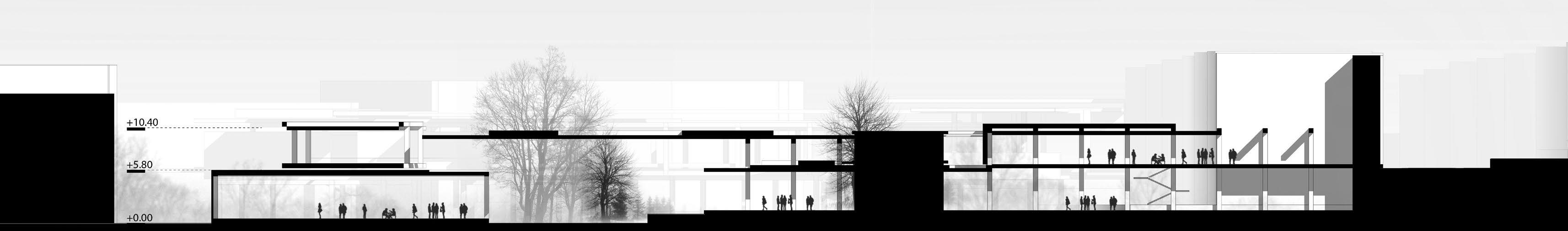 The building section focuses on allowing direct sunlight to enter the open spaces and through the first floor level to the ground floor level. It also keeps a vertical circulation through the building levels and an open ground floor to connect urban life with the building.