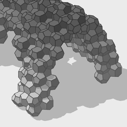 This project investigates the application of space-filling polyhedra, specifically the Weaire-Phelan structure, in architectural construction through parametric modeling and robotic fabrication methods. Inspired by geometric efficiencies exemplified in iconic structures such as the Water Cube (2008 Beijing Olympics), the study develops a pavilion using modular polyhedral units. The research integrates digital design and robotic manufacturing, employing EPS foam as a material due to its lightweight, cost-effectiveness, and suitability for robotic hot-wire cutting.