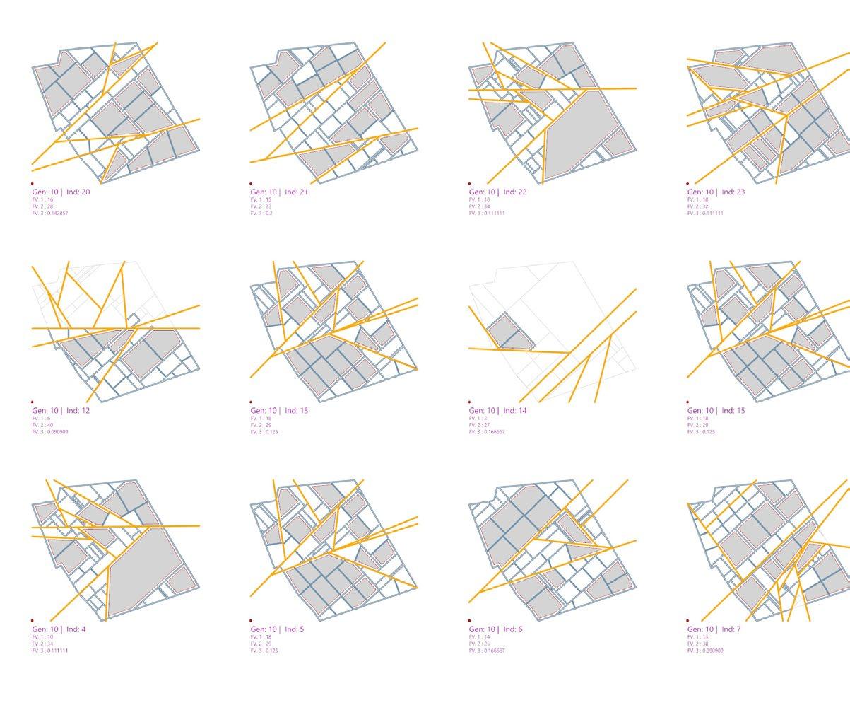 This script runs over 1000 iterations at a time and filters through them, outputting the best 50 plans. To ensure that the end results were usable, we set the number of buildings and greenery as objectives to filter through them. The next step was to manually review the outcomes and edit them to fit our needs and the site requirements.