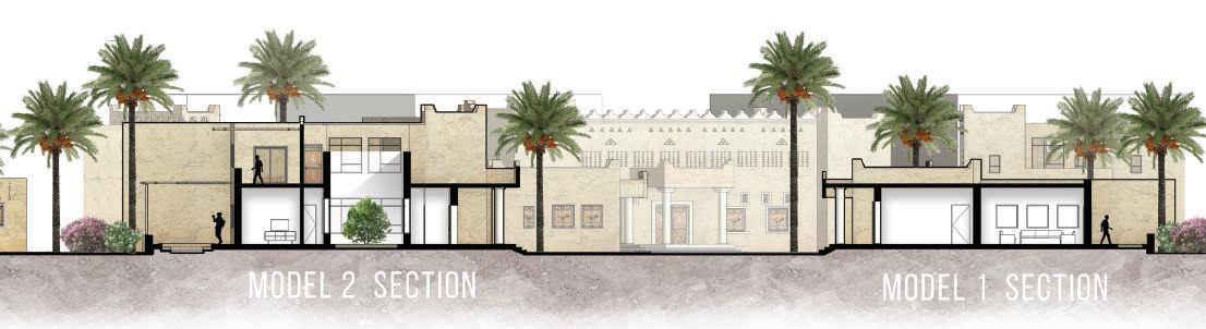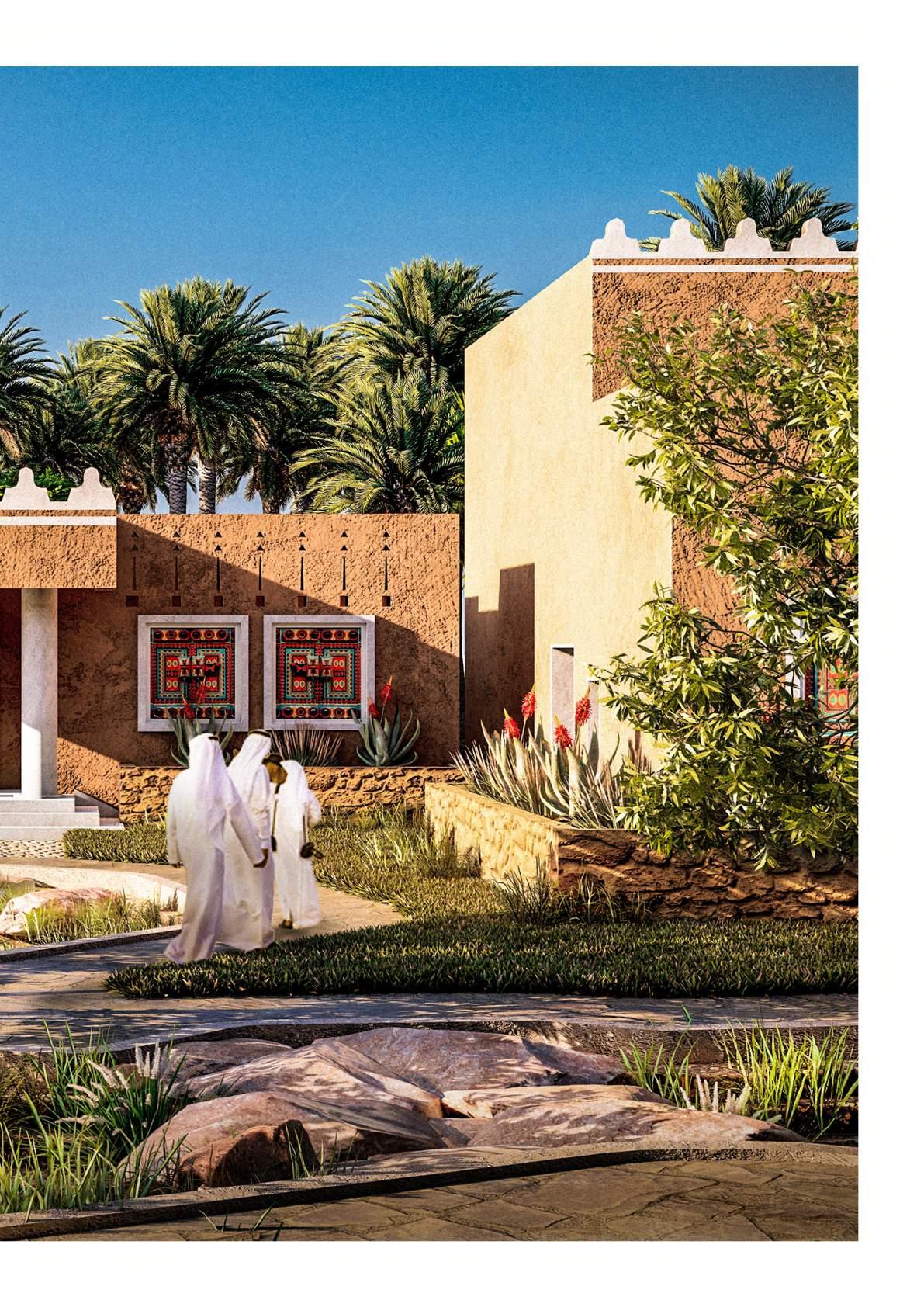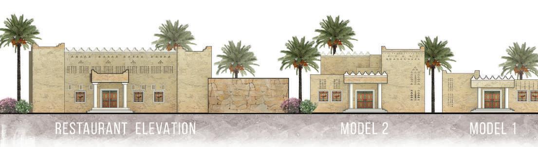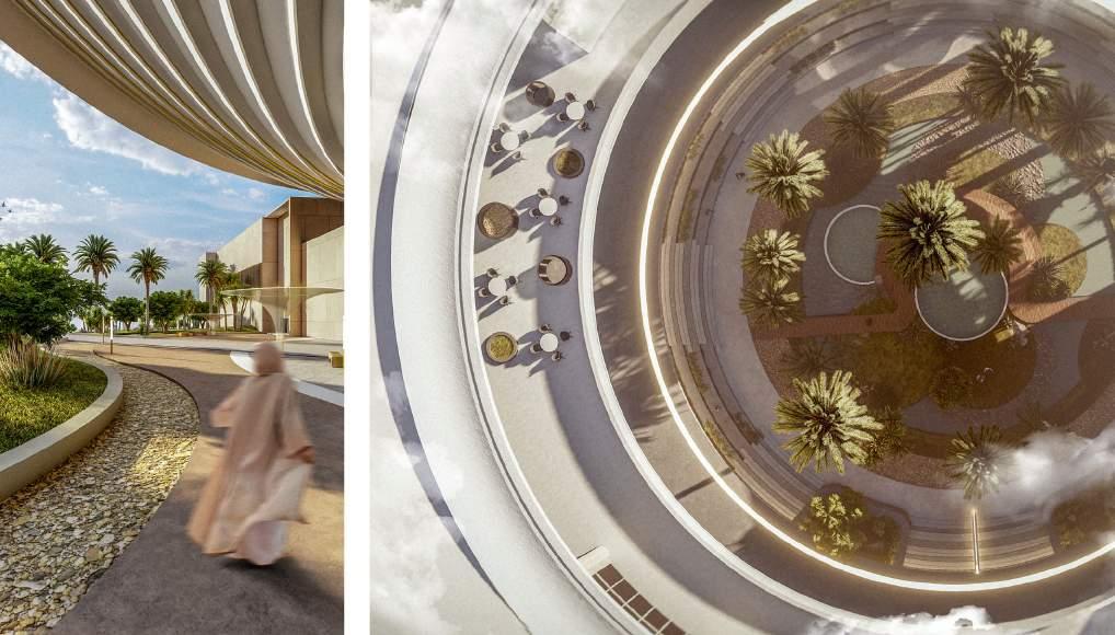 The formation is inspired by the growth of civilization where Architecture began to exist among the nature then it develops into flexible composition in modern day, The nature is represented by oasis plaza in the center, and the architecture is inspired from the urban fabric of old Riyadh city, then implemented the local tent in a modern way through the circular structure forming a social hub.