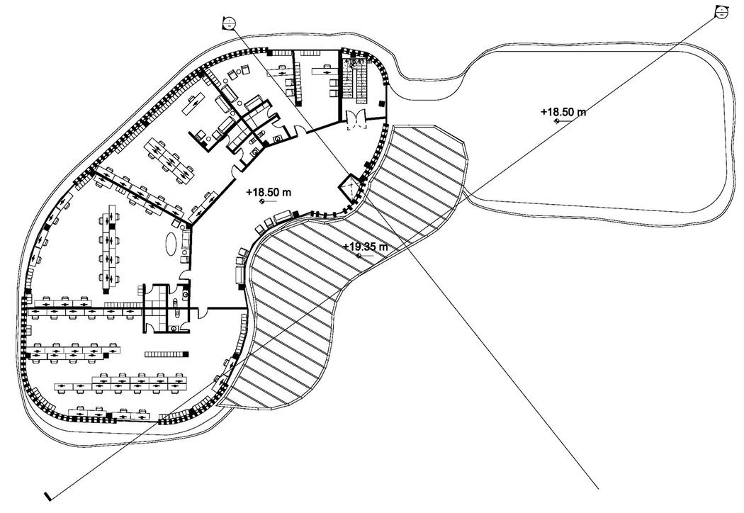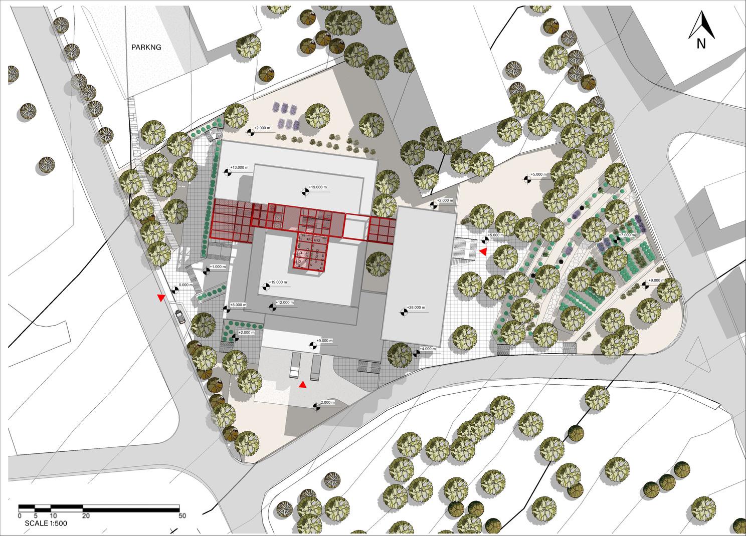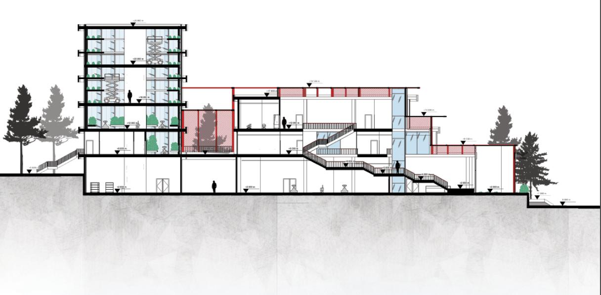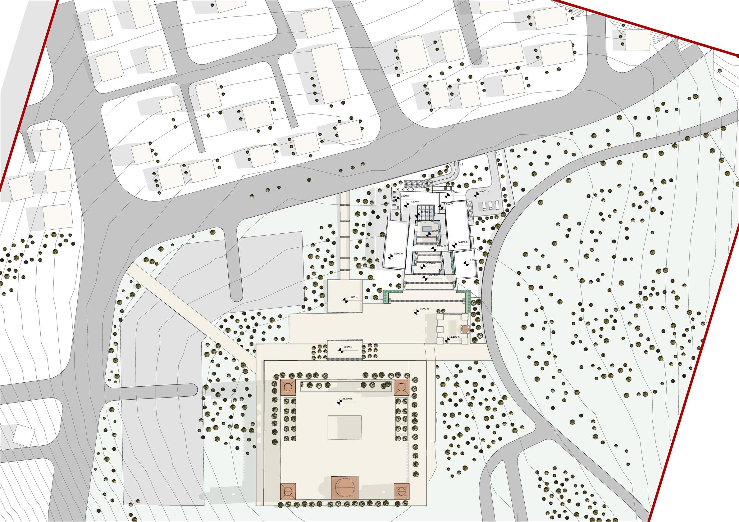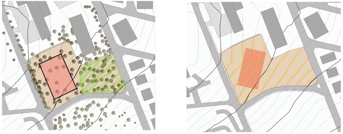 THE BUILDING WAS PLACED IN AN AREA WITH FEWER TREES; TO REDUCE THE NUMBER OF FELLED TREES