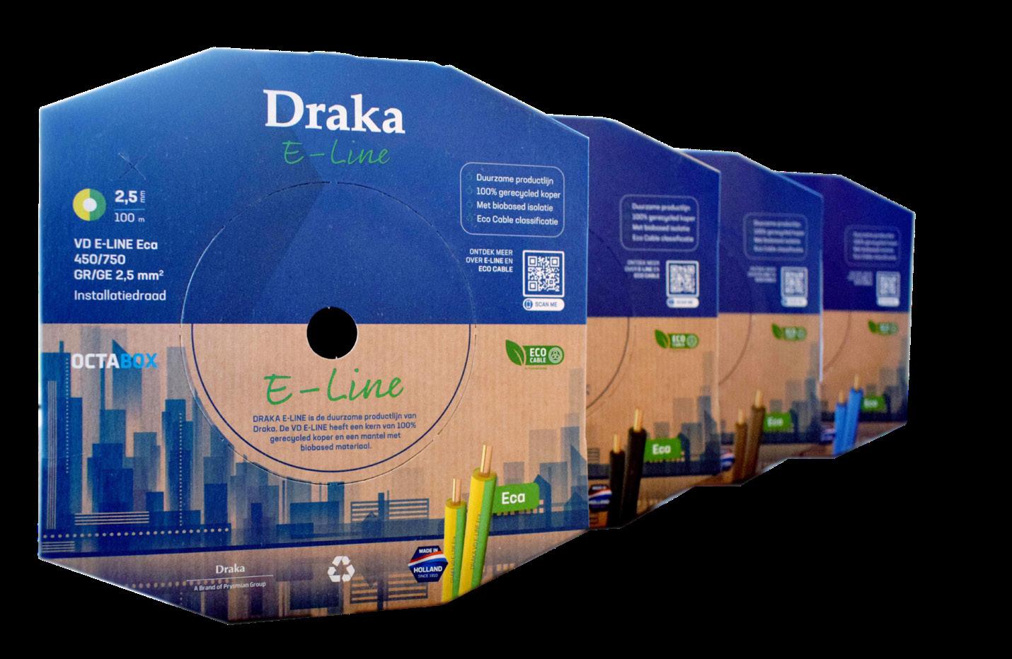 De VD E-LINE kabels vallen binnen de nieuwe Draka E-LINE productlijn. De kabels bevatten 100% gerecycled koper en hebben een biobased oplossing als vulmiddel in de mantel. De Octabox verpakking is bovendien volledig