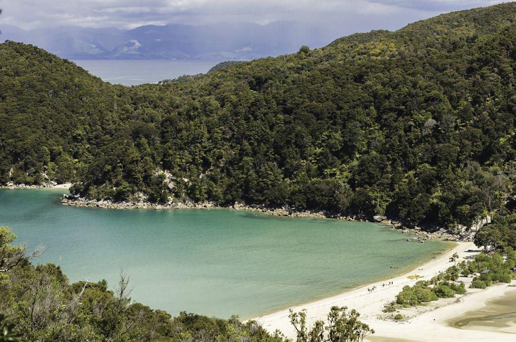 After a short 10-minute uphill walk from Tinline you’ll find yourself looking down at a little beach called Coquille Bay, the first of the park’s classic, Abel Tasman-esque, crescent-shaped, golden-sand beaches. Coquille is fringed with native bush including some punga ferns so it looks rather magical from the lookout on the track above. It is also the first beach in the Abel Tasman that has deep water during all tidal conditions. The Coquille Bay campsites are right beside the beach with room for 12 people. The bay is named after d’Urville’s vessel La Coquille, the original name for what was to be renamed the Astrolabe.