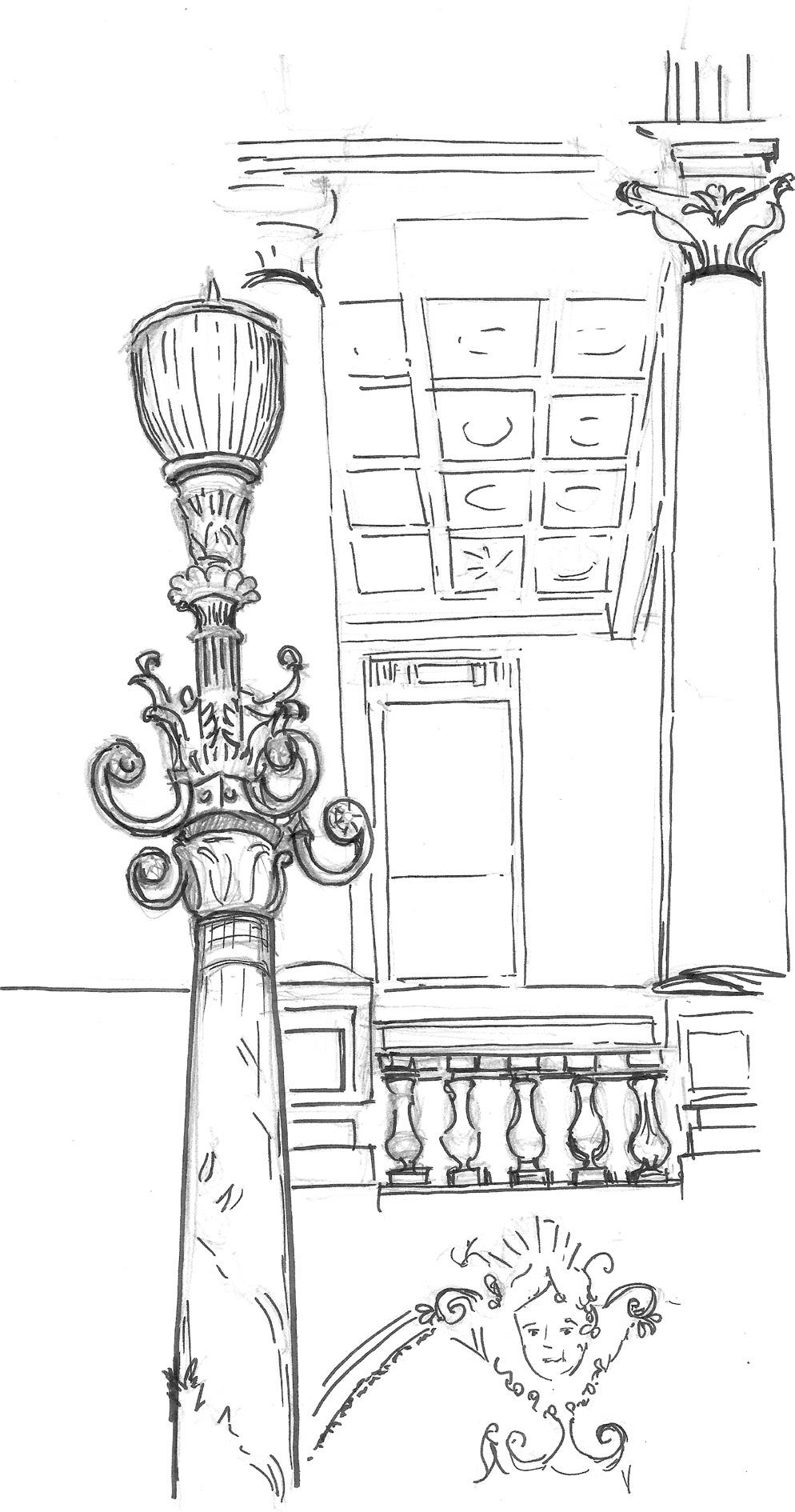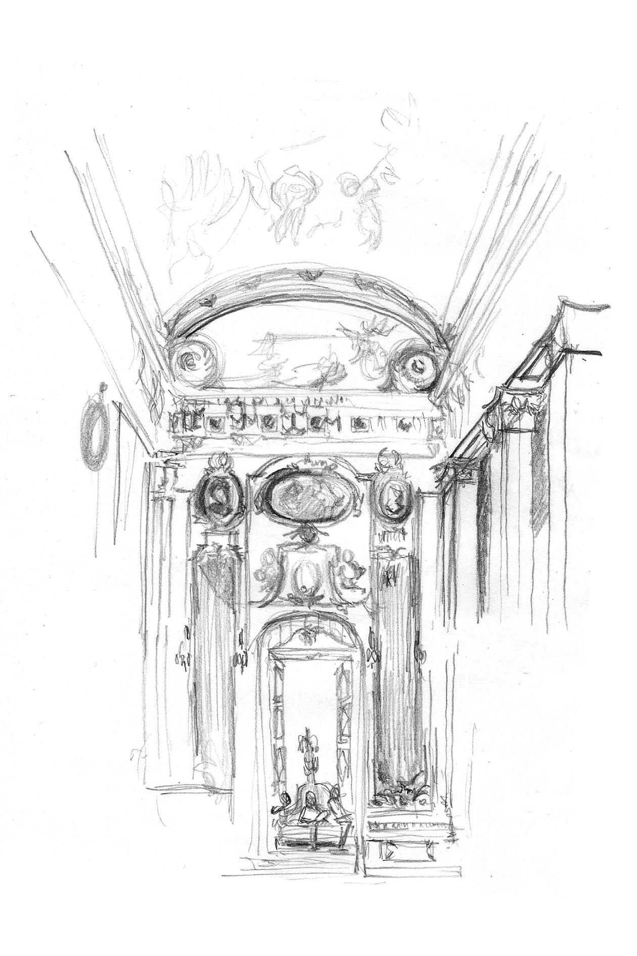 There are many details, ornaments, and observational drawing requires the definition of a focus for the gaze, time only allows for sketches of what is seen.