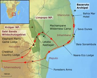 Wild und ursprünglich - so könnte man die Küste im südlichen Mosambik bezeichnen. Kilometerlange, einsame Sandstrände, unberührte Dünen wälder, eine artenreiche Unterwasserwelt, ein endloser Ozean und Hori zont, der am Abend in warme Rot- und Orangetöne getaucht wird und natürlich Ruhe und Erholung. Das ist es, was Sie in Machangulo finden. Weit abseits des hektischen Lebens unserer Zeit liegt eingebettet in einen kleinen Wald zwischen den Dünen mitten innerhalb des Maputo Elephant Naturreservates die Machangulo Beach Lodge. Hier genießen Sie eine sehr herzliche und angenehme Atmosphäre und werden sich sofort wohl fühlen.