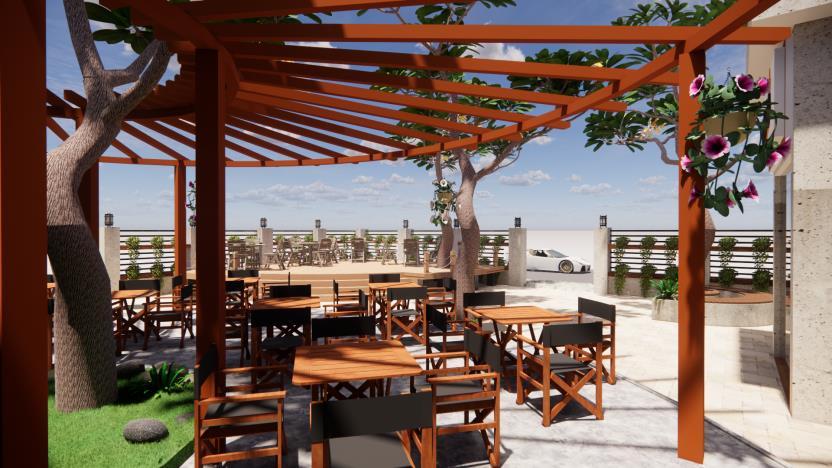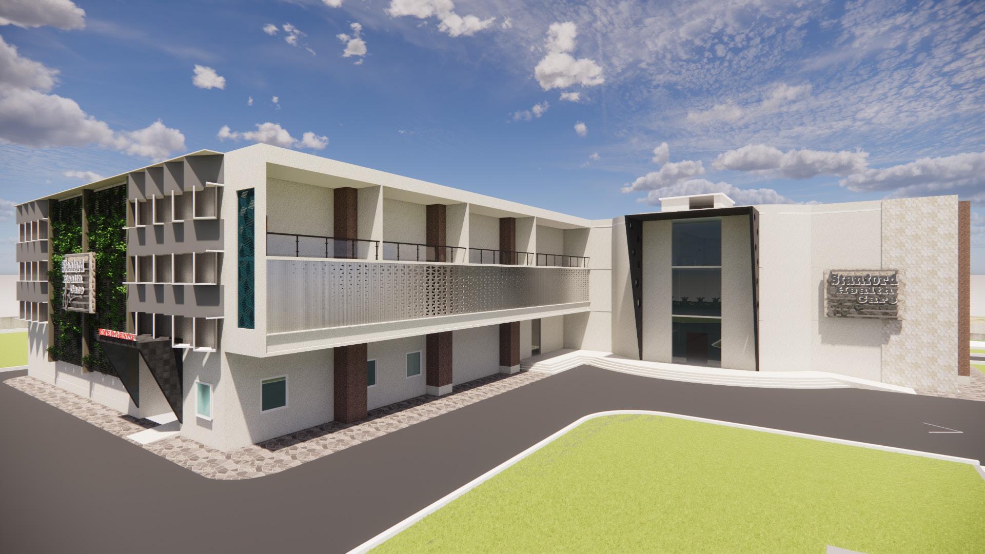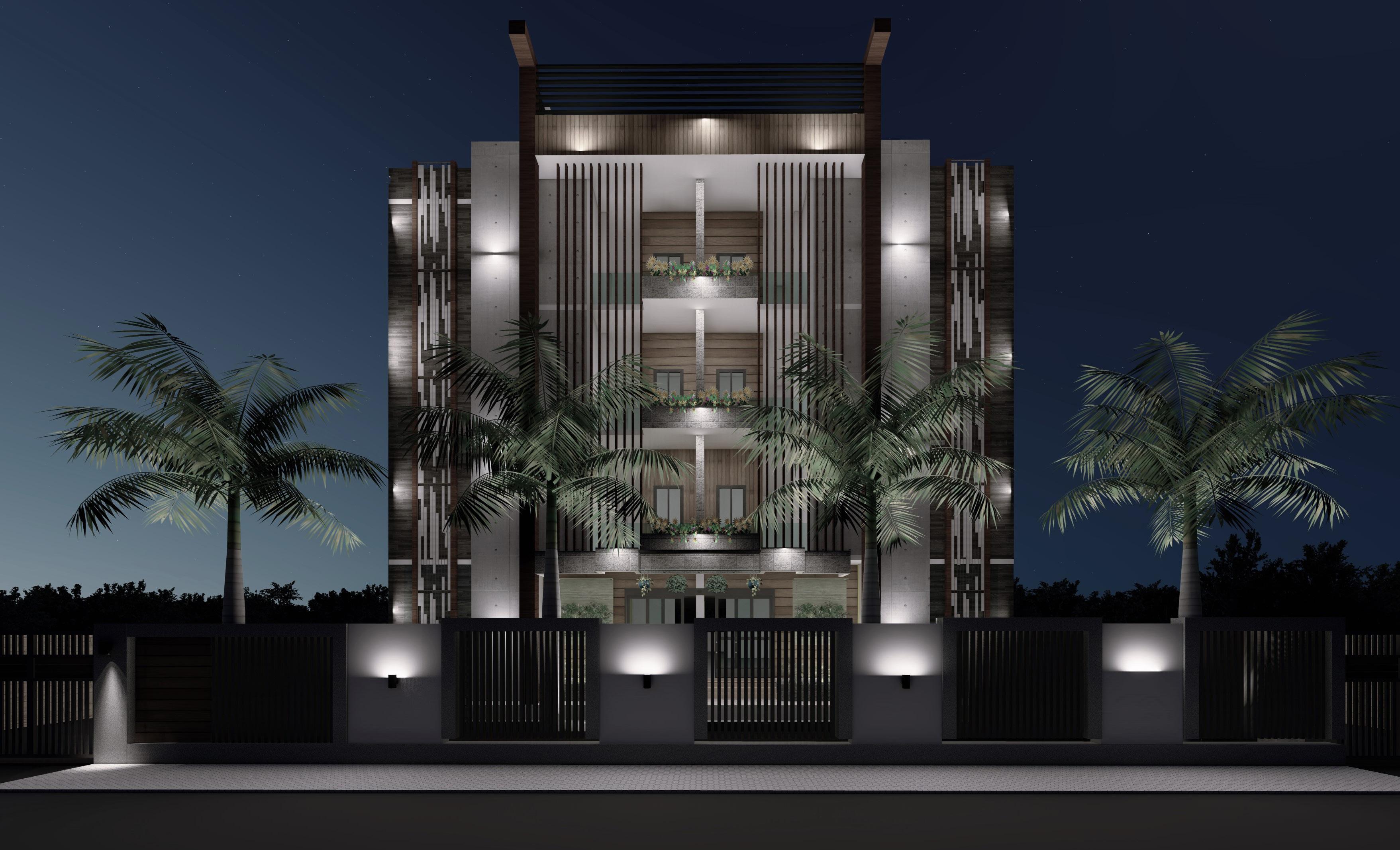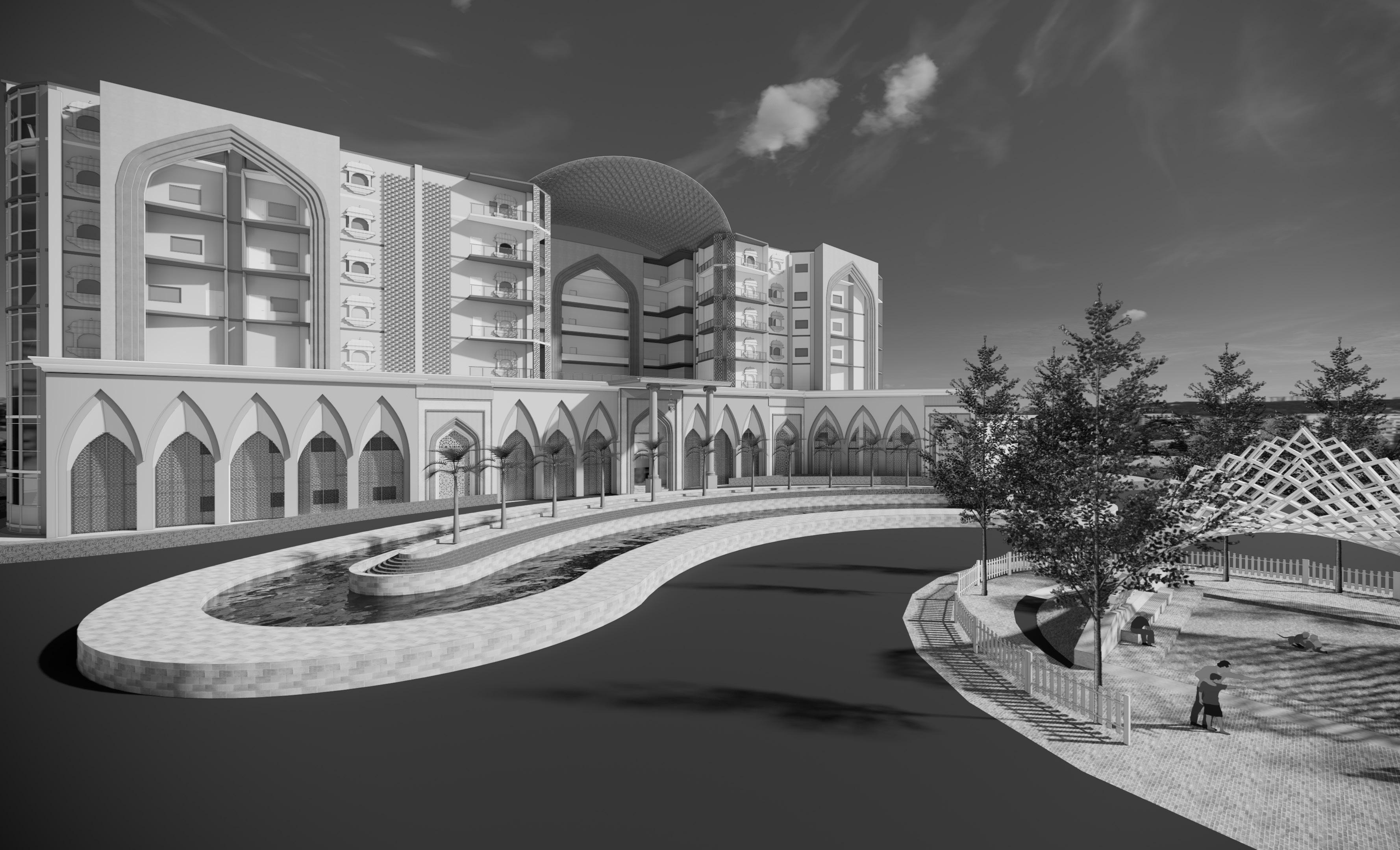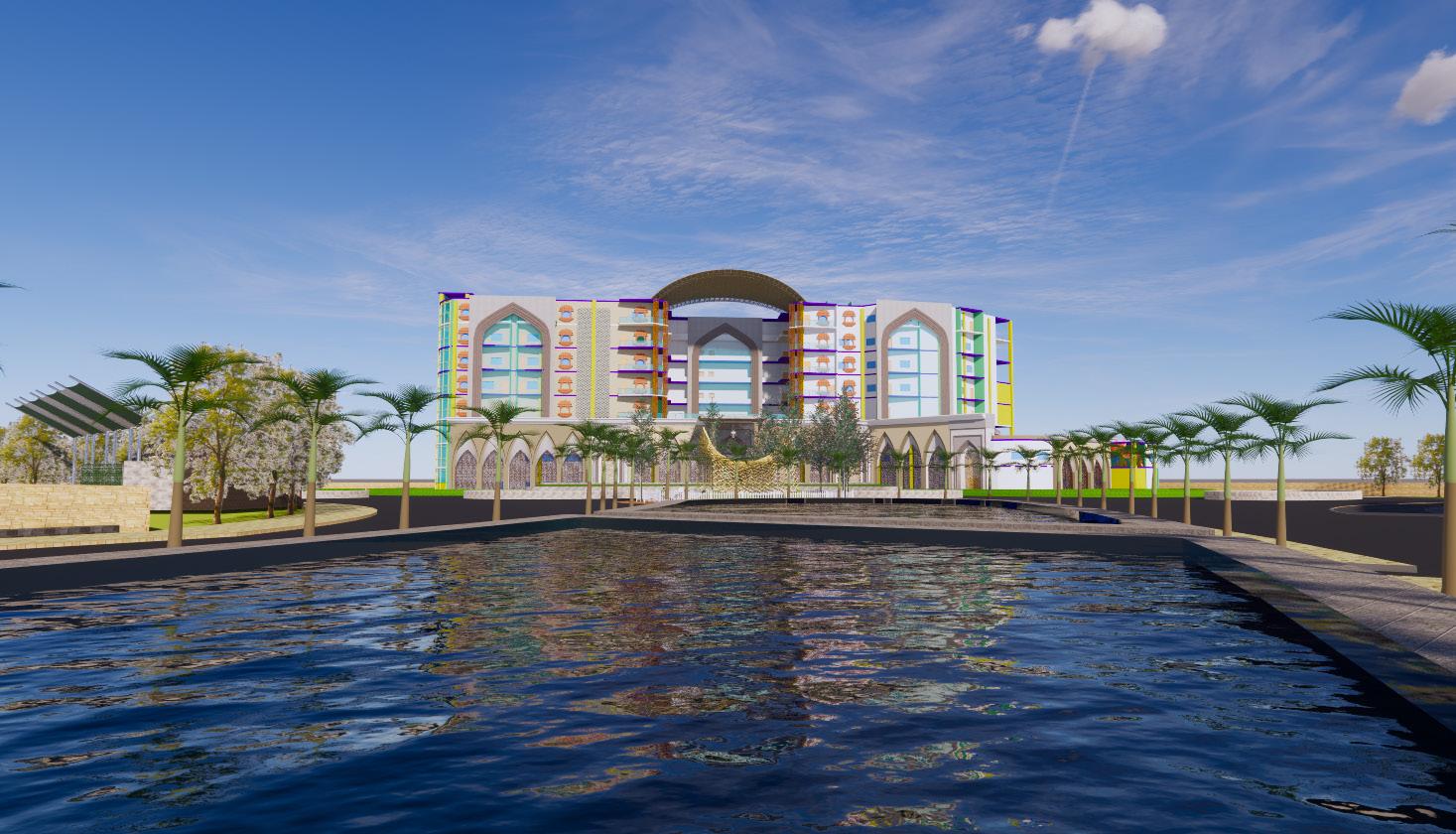 3D VIEWS PROJECT - FIVE STAR HOTEL PLOT AREA 60495 SQM BUILT UP AREA 4226 SQM TOTAL BUILT UP AREA 29600 SQM SETBACKS FRONT 18 M BACK 09 M SIDE 09 M BYELAYS TOTAL PERMISSIBLE FAR 4 TOTAL ACHIEVED FAR 0.33 TOTAL PERMISSIBLE G COVERAGE 24198SQM TOTAL ACHIEVED G COVERAGE 6090SQM TOTAL PERMISSIBLE HEIGHT 63M TOTAL ACHIEVED HEIGHT 37.5M PARKING (200) STAFF TOTAL NO PF ECU (FOUR WHEELER) 32 TOTAL NO OF ECU (TWO WHEELER) 33 (11 UNIT) VISITORS TOTAL NO PF ECU (FOUR WHEELER) 56 TOTAL NO OF ECU (TWO WHEELER) 81 (27 UNIT) N