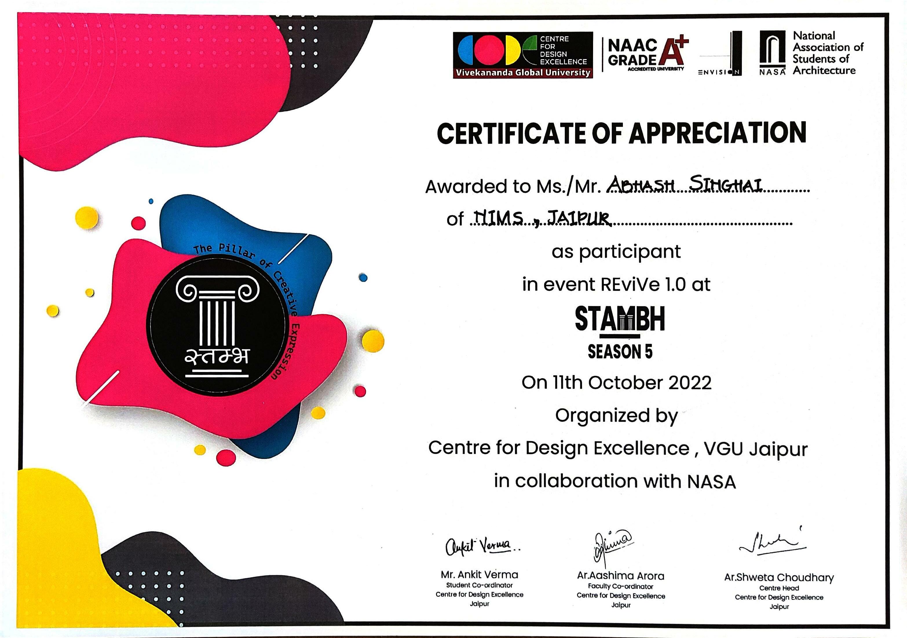 PERSONAL DETAILS ED uc ATION SOFTWARES PERSONAL SKILLS WORKSHOPS c OMPETITION HOBBIES SSC: GYANODAYA VIDHYA MANDIR HSC: GYANODAYA VIDHYA MANDIR B.ARCH : NIMS SCHOOL OF ARCHITECTURE & PLANNING COURSE ON RHINOCEROUS AND GRASSHOPER (MODEL MAKING) TENSILE WORKSHOP POTTERY WORKSHOP SCULPTURE WORKSHOP MODEL MAKING WALL PAINTING REVIVE 1.0 - CAMPUS INTRACTIVE SPACE REVIVAL (VGU JAIPUR) JAF - JAIPUR ARCHITECTURE FESTIVAL SKETCHING / PAINTING TRAVELLING PHOTOGRAPHY DIGITAL ARTWORK CRITICAL THINKIMG INTERPERSONAL SKILL MOTIVATION TIME MANAGEMENT TEAMWORK FLEXIBILITY DEPENDABLE DEDICATION LEADERSHIP AUTOCAD PHOTOSHOP SKETCHUP ENSCAPE VRAY LUMION REVIT RHINOCEROUS GRASSHOOPER PREMIUM PRO INDESIGN MS WORD MS EXCEL POWERPOINT CRICKET BADMINTON E-SPORTS AR c HITE c T u RE DESIGN WORK HOSPITAL DANCE AND DRAMA INSTITUTRE 5 STAR HOTEL APARTMENT SUPERMARKET INTEGRATED TOWNSHIP ISBT (INTER STATE BUS TERMINAL) STADIUM (V SEM) (V SEM) (VI SEM) (VI SEM) (VI SEM) (VII SEM) RUNNING (VII SEM) RUNNING (VII SEM) RUNNING