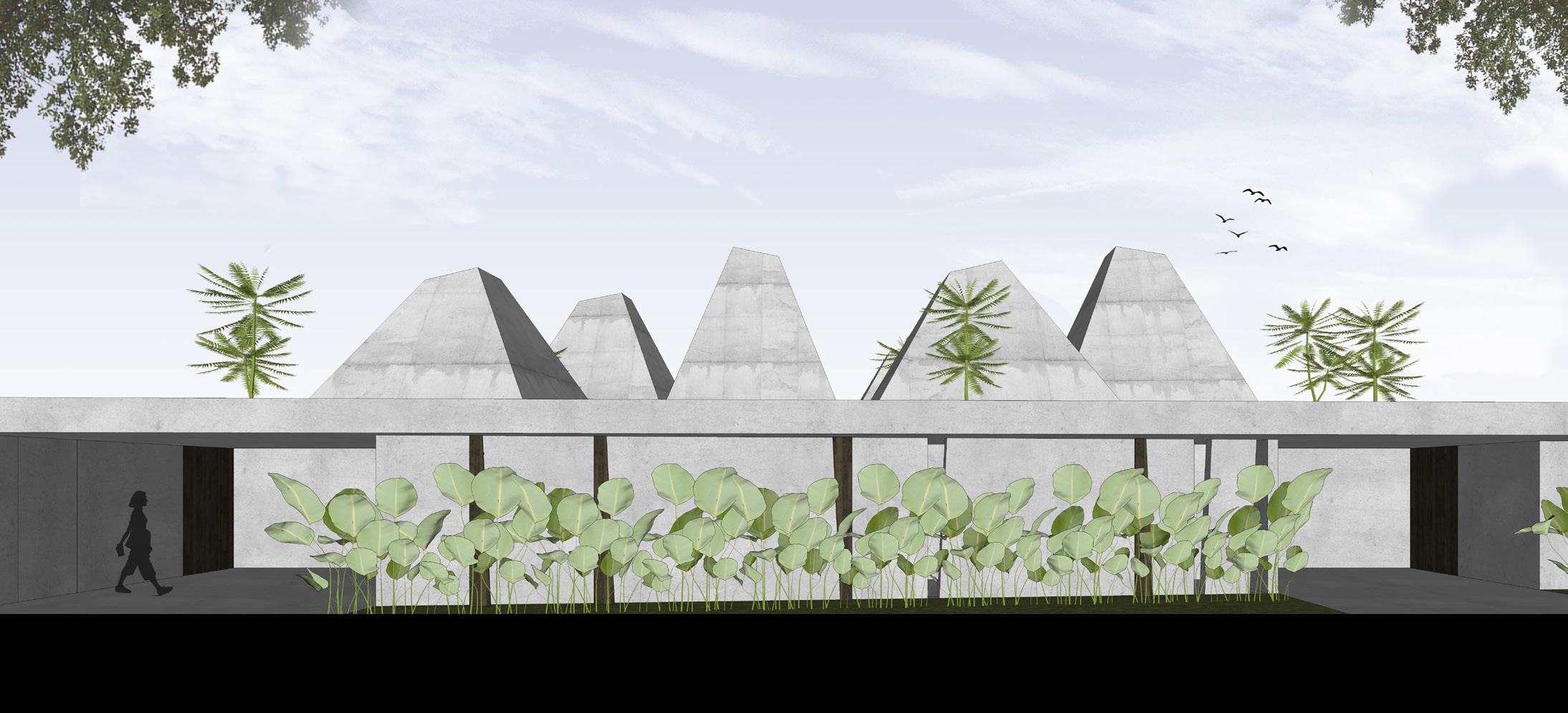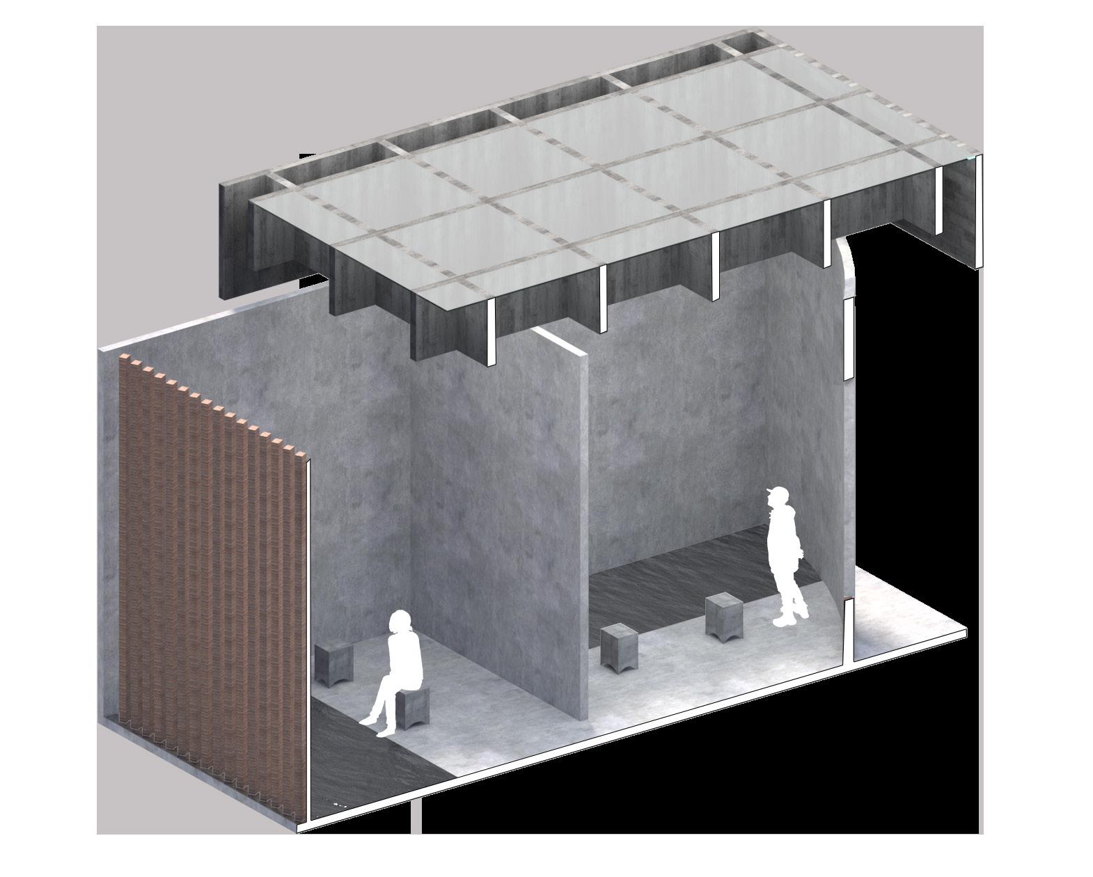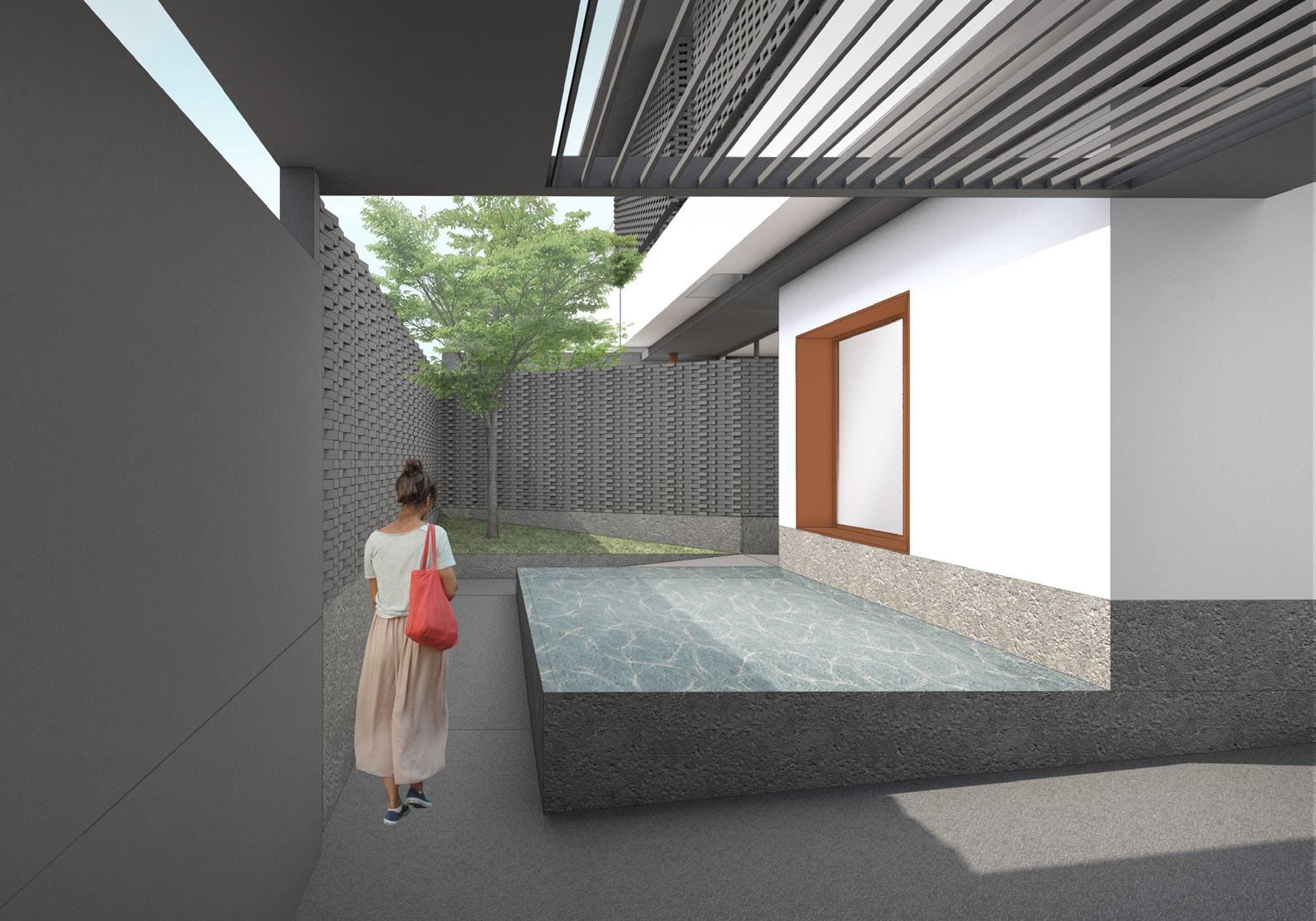 The space consists of two main elements; the wall and the roof. The dividing wall is designed to maximize the spacial impression that occurs in the building, namely as a visual and audial buffer so that the experience gained in the building can be maximized. Designed using the waffle system, covering two-thirds of the building, the roof set to make rainwater attraction towards the pool.