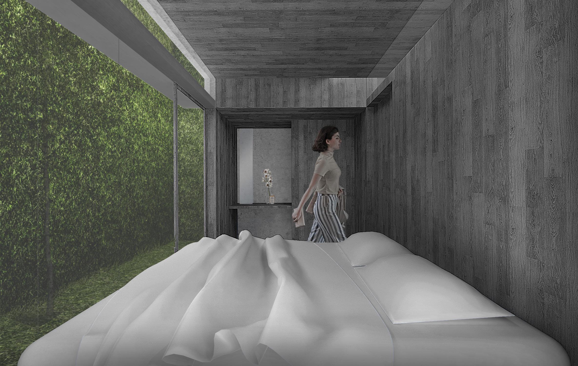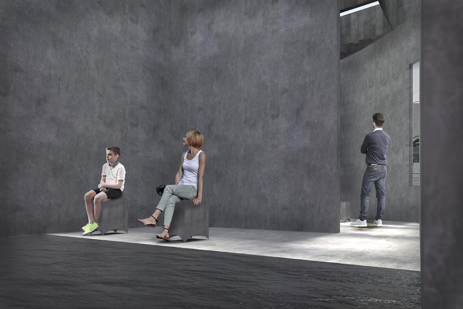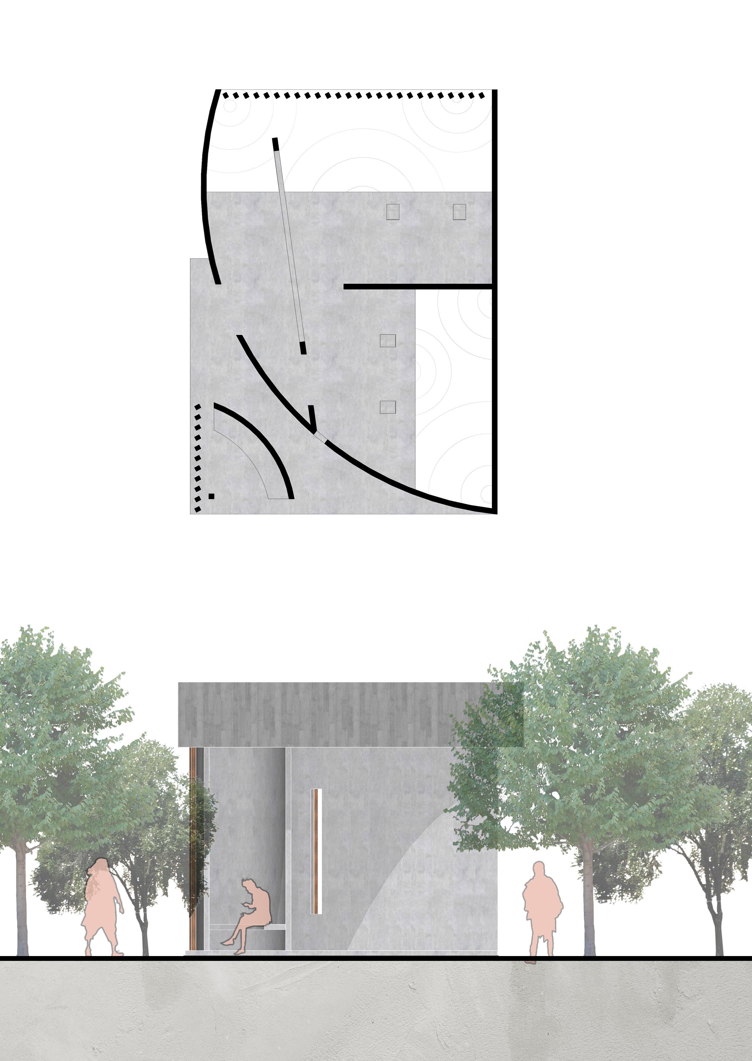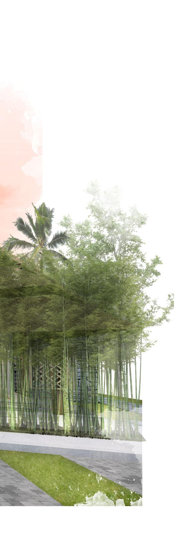 The space consists of two main elements; the wall and the roof. The dividing wall is designed to maximize the spacial impression that occurs in the building, namely as a visual and audial buffer so that the experience gained in the building can be maximized. Designed using the waffle system, covering two-thirds of the building, the roof set to make rainwater attraction towards the pool.