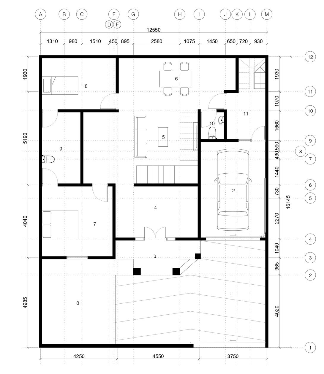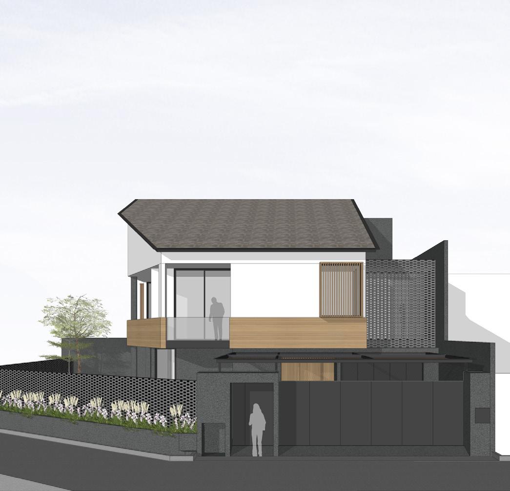 The master bedroom position is placed in the area behind the site facing directly to the site boundary wall that is used as a creepage area. This wall is also a view for both floors in a compact residential. In the limited dimensions of space, the master room gets optimal space quality.