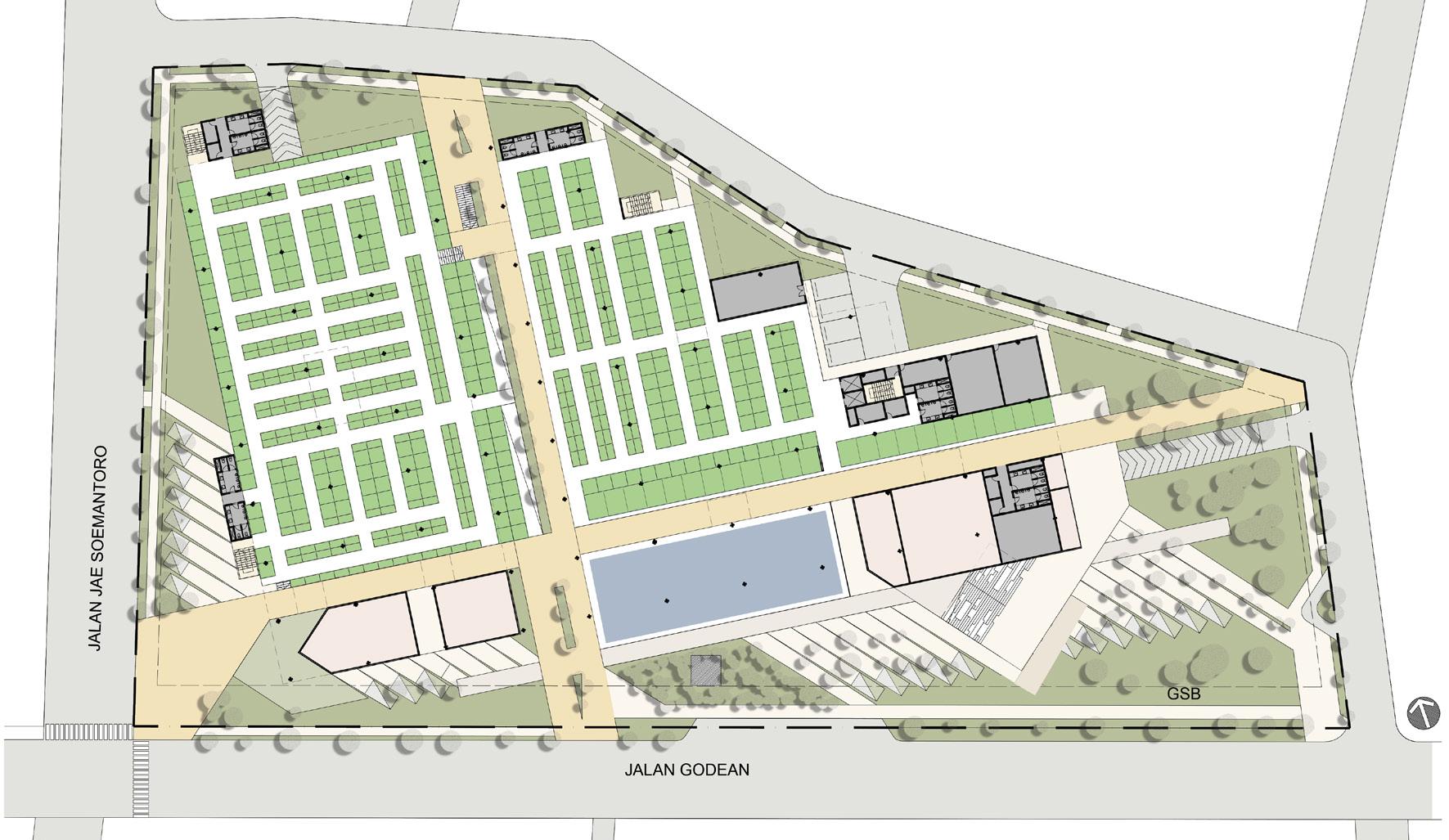 The open space amid the site is set to be used for various functions, mainly as a place to gather and carry out communal activities in the building complex. Surrounded by the main access in the building, the pathway formed into interconnected corridors.