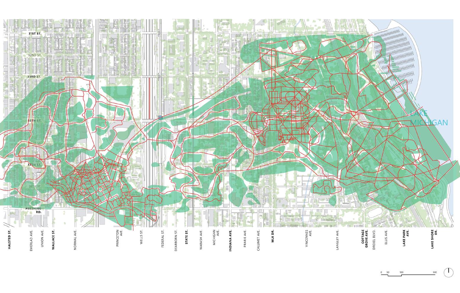 The 35th Street Arboretum aims to extend the existing natural lakefront throughout the Bridgeport and Bronzeville neighborhoods. The extents of the arboretum are determined by pedestrian and ecological pathways that branch out from Lake Michigan to S. Halsted Street.