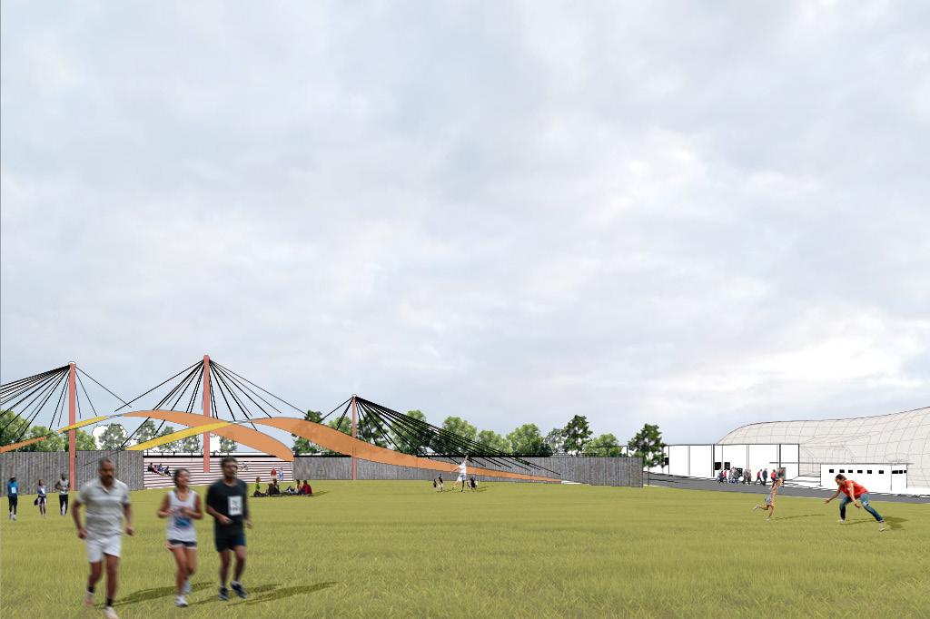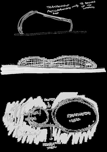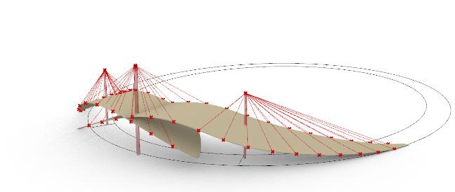 Since the site is recessed in by 7m from the road level, it does’nt catch up any attention from the onlookers. So, I needed something that is Inviting/ welcoming acting as a grand entry. To do that, there is a scope to design something at the ground which could also act as a pavilion for the gallery seating. A shell structure suspended with suspension ropes has been designed so that it is grand, inviting and also act as a pavilion for the gallery at the same time.