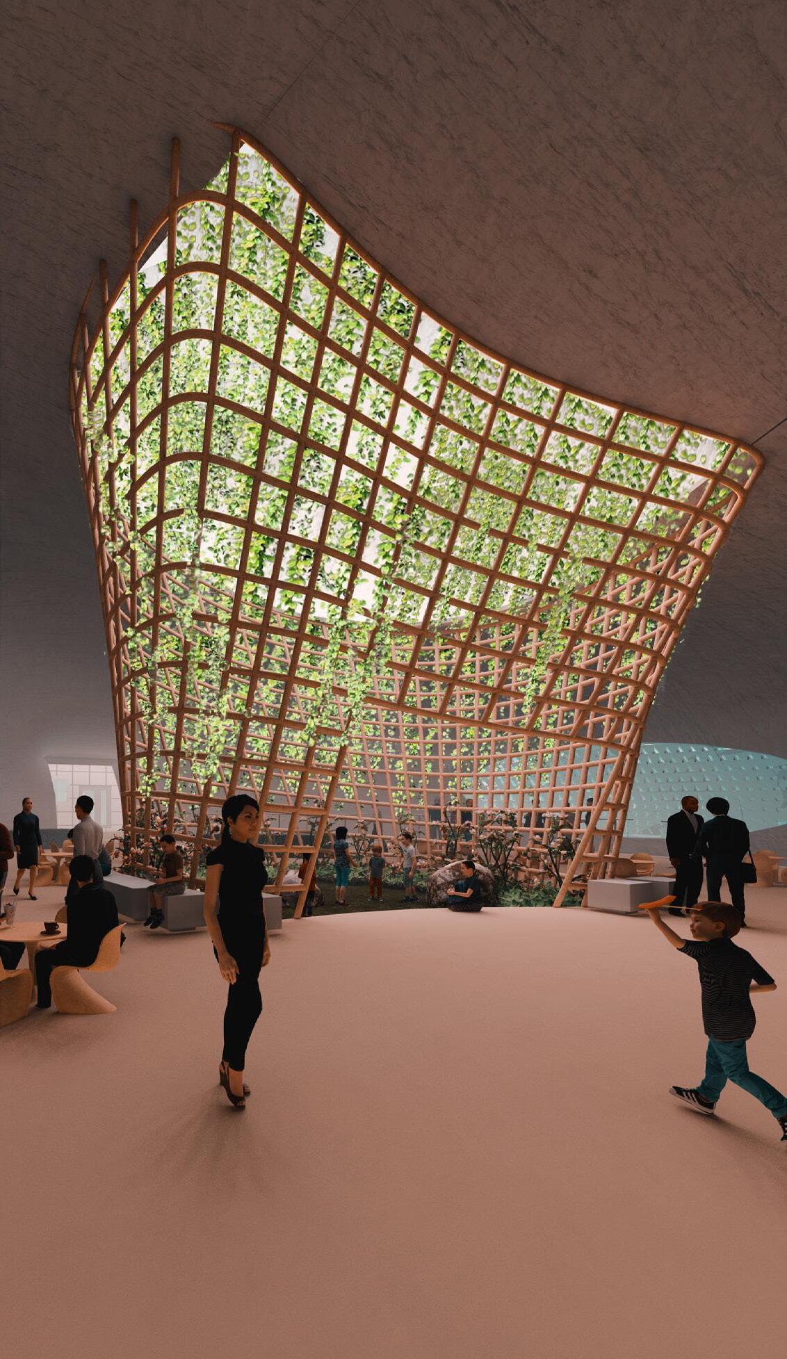 The stalactite columns help the roof blend into the ground seamlessly