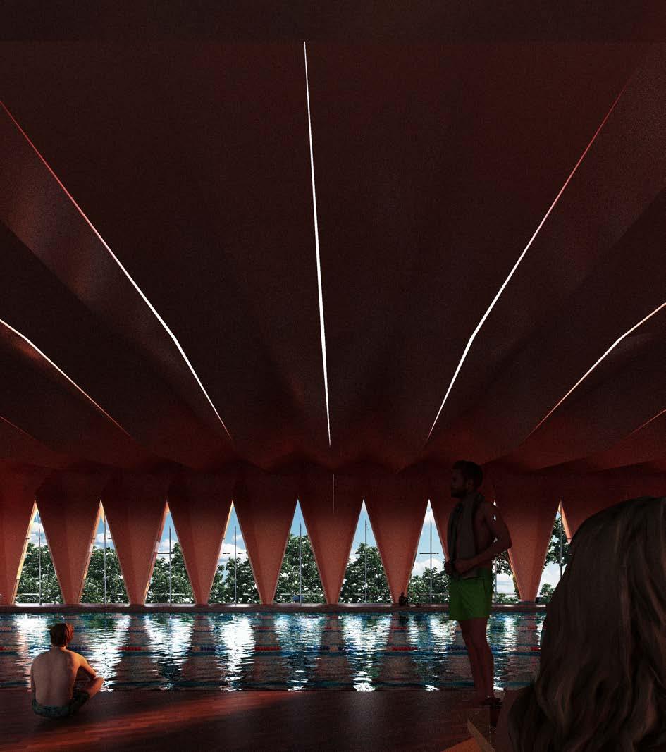 The swimming pool block is located on the southern most part of the site where there is an existing natural vegetation. The swimming pool needs to be protected against the weather conditions while providing barrier free and column free internal space, which is achieved by lightweight and long span structure. So, a folded plate structure has been designed such that it allows the north light into the indoors while cutting down the south glare and radiation inside. It has also enabled to provide a beautiful view to the users from the indoors to the outdoors while not compromising on the privacy.