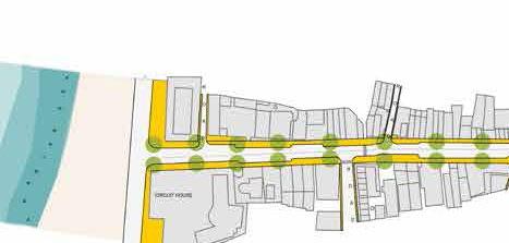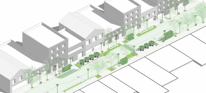 Zone A SHARED STREETS | Driveways + Walkways PLACE MAKING | Market Stalls & Bus Shelters + Green Pockets + Parklets + Sidewalk Cafes + Benches STREETSCAPE | Dustbin + Lighting & Security Cameras + Signage & Advertising + Trees Street View After Intervention View representing longitudinal street after the intervention. Plan representing Zone A