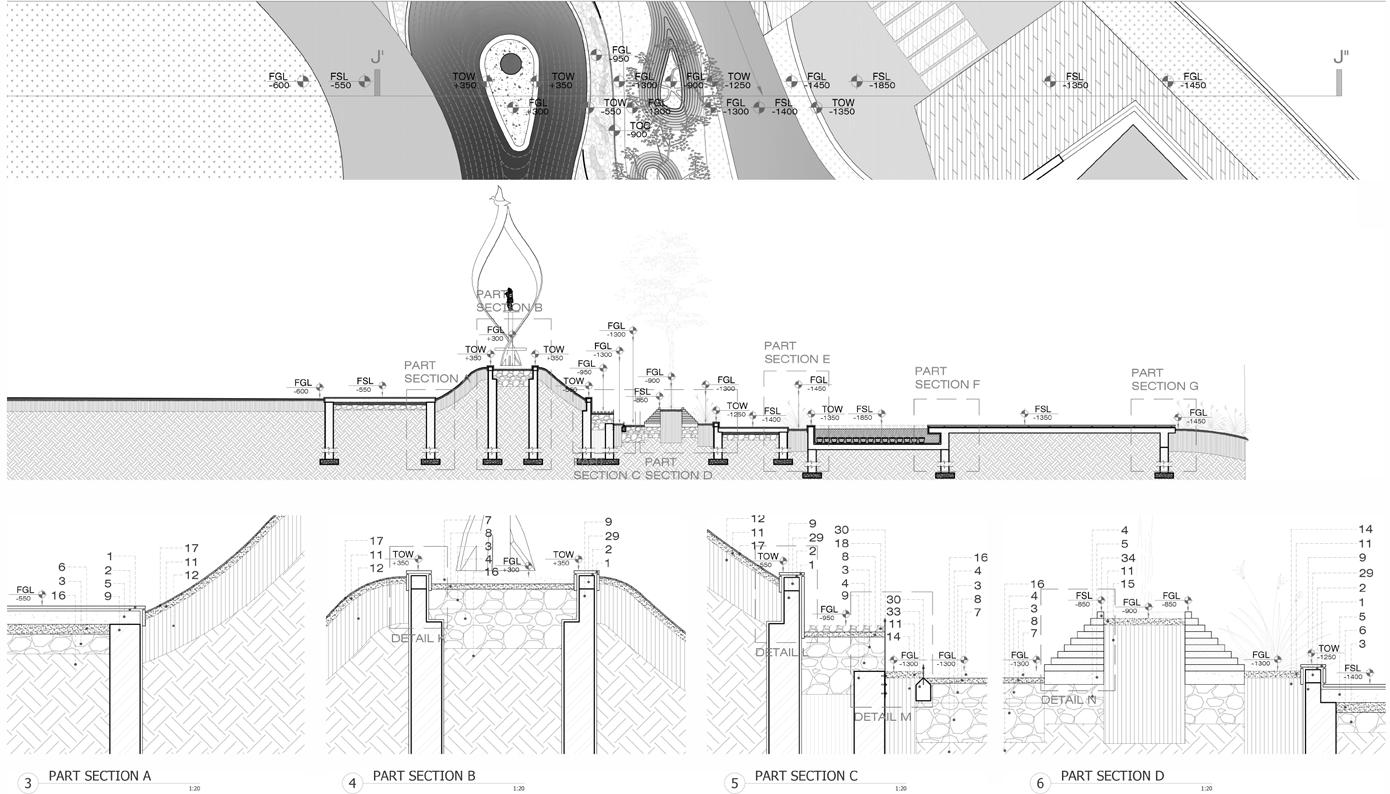 The idea was to develop the land in such a way that it responds towards the regeneration of the area by minimizing the flooding effects of natural local species of vegetation which act as buffer between the public areas and the waterfront.