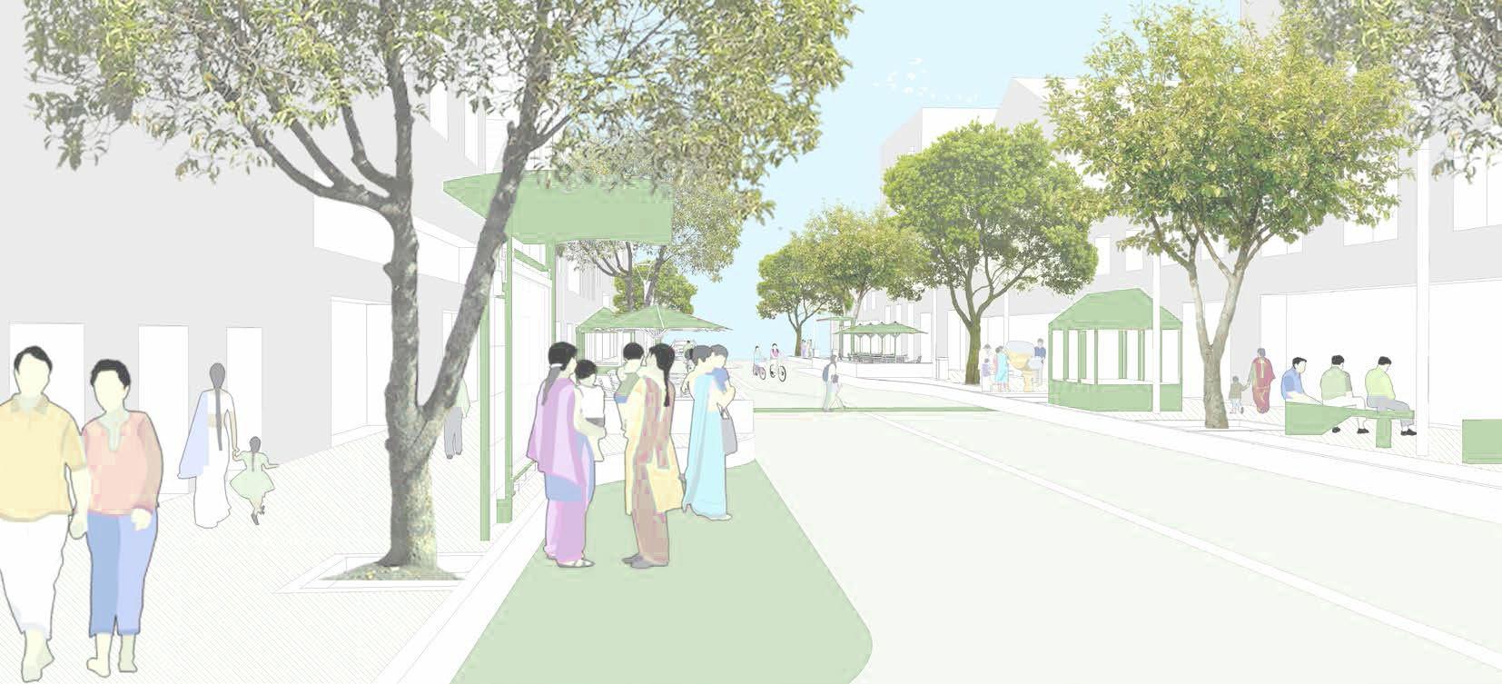 MAKING | Market Stalls & Bus Shelters + Green Pockets + Parklets + Sidewalk Cafes + Benches STREETSCAPE | Dustbin + Lighting & Security Cameras + Signage & Advertising + Trees Street View After Intervention