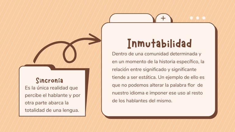 De acuerdo a lo que Ferdinand Saussure investigó, nos dejó en claro que, existe la mutabilidad en la diacronía que significa "cambio a través del tiempo", la diacronía estudia el cambio de las palabras a través de los años y la inmutabilidad en la sincronía significa que no cambia porque yo quiera que cambie, cambiarán las palabras cuando los profesionales en el tema consideren correcto que cambie. Esta se divide en arbitrariedad, tomando el ejemplo de la palabrsignifica que no hay lógica por el cual la flor se llame flor. Lo convencional es cuando el objeto de la "flor" es aceptada por la sociedad para nombrarla así, por lo que, de ahora en adelante la nombrarán así. La linealindad es la forma en que leemos las palabras, de izquierda a derecha de manera horizontal.