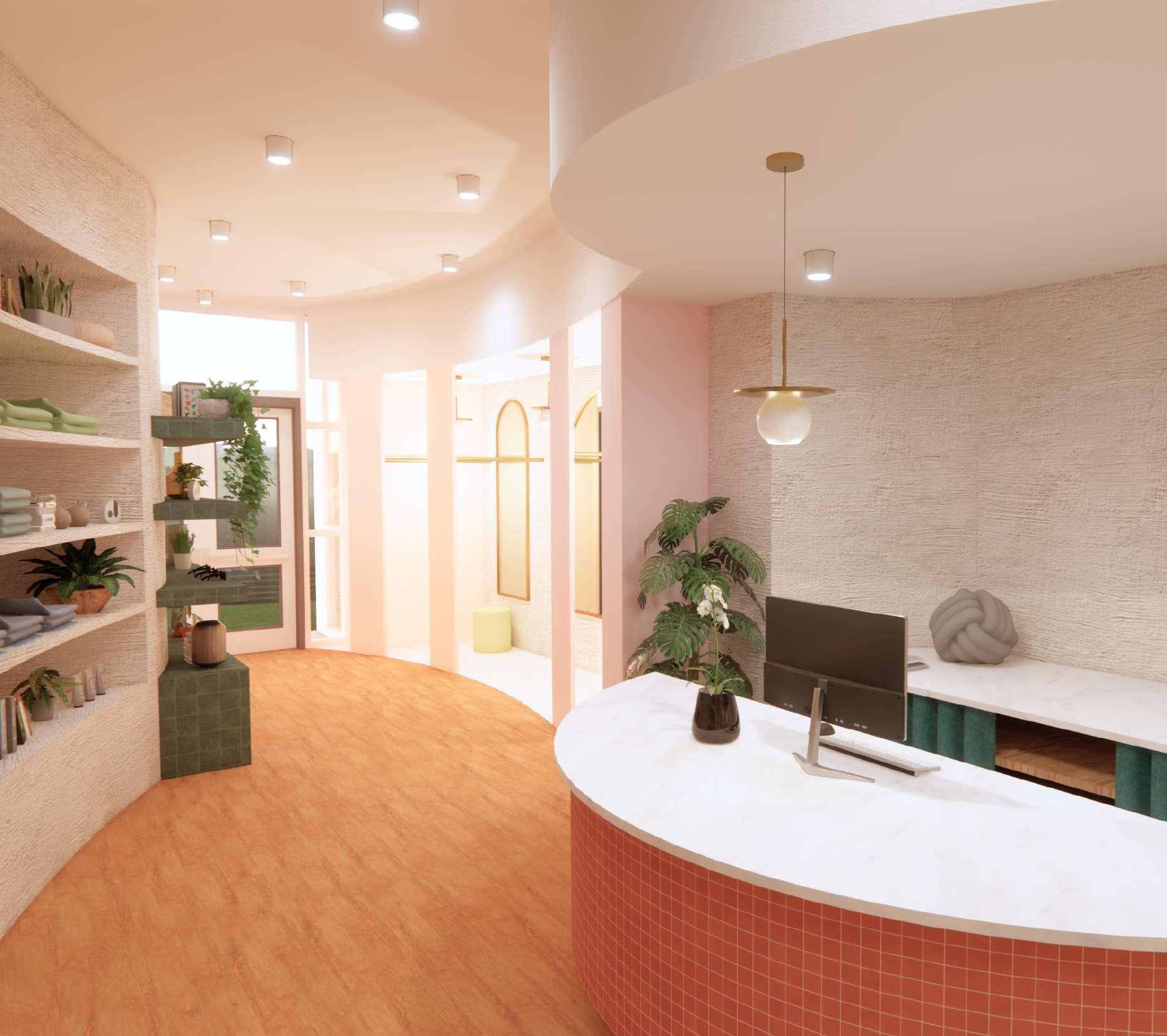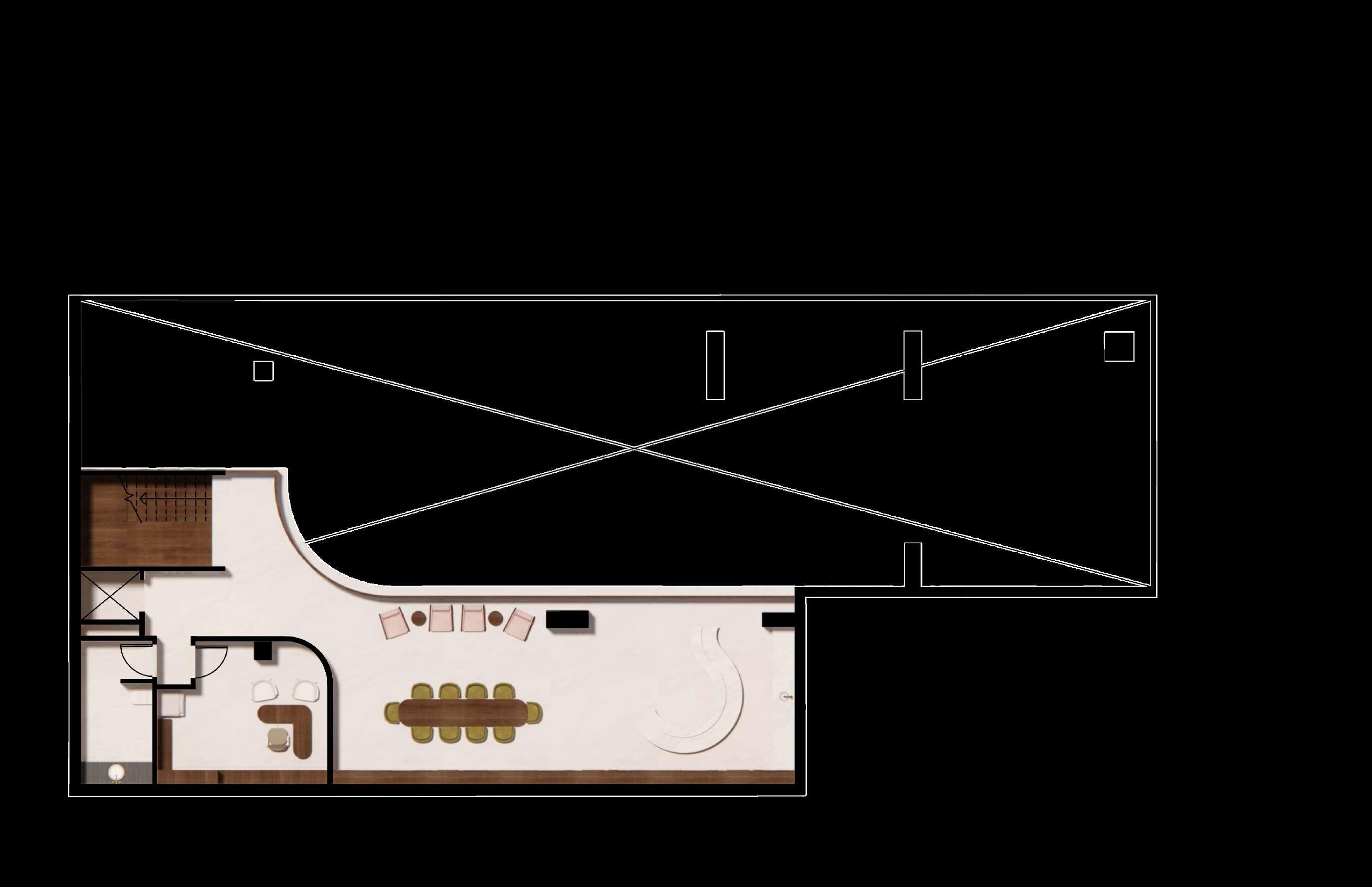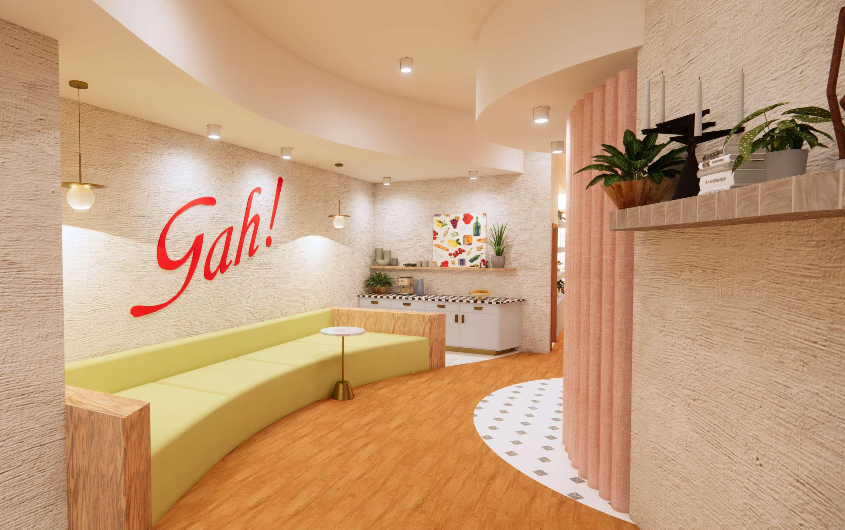 Taking great inspiration from Lisa Says Gah s values and designs, I created a space that is harmonious and unified yet bold and abstract A space that is trying to define ‘Gah! ; An unbridled outburst-ing of surprise and delight - “We like to think it can t be bottled or contained”. The parti diagram that was developed was based solely on the definition of ‘Connection’; The state of being connected: joined or linked together. I used geometric shapes that intertwine with a flowing path throughout the space to allow for separation yet integration.