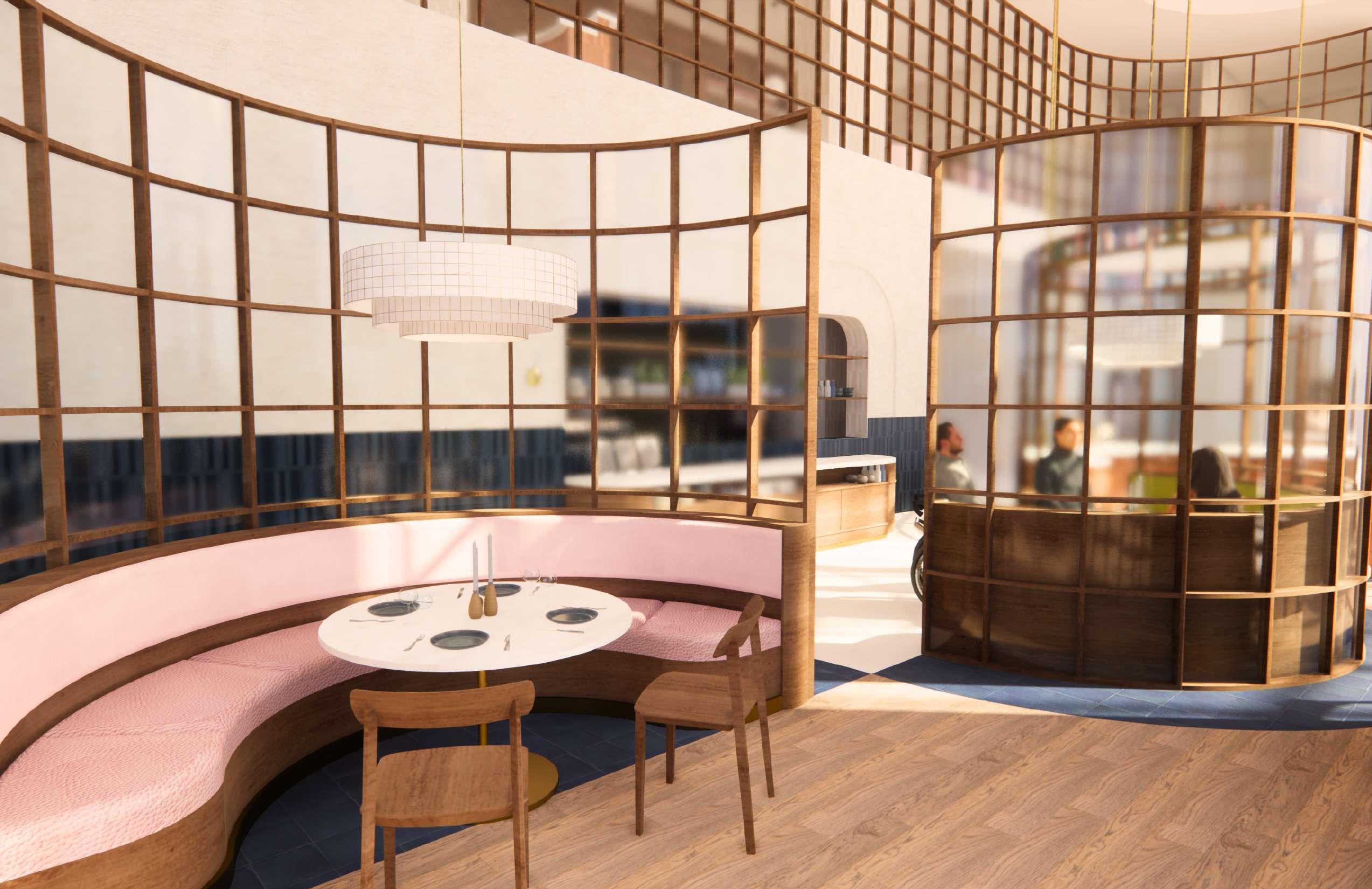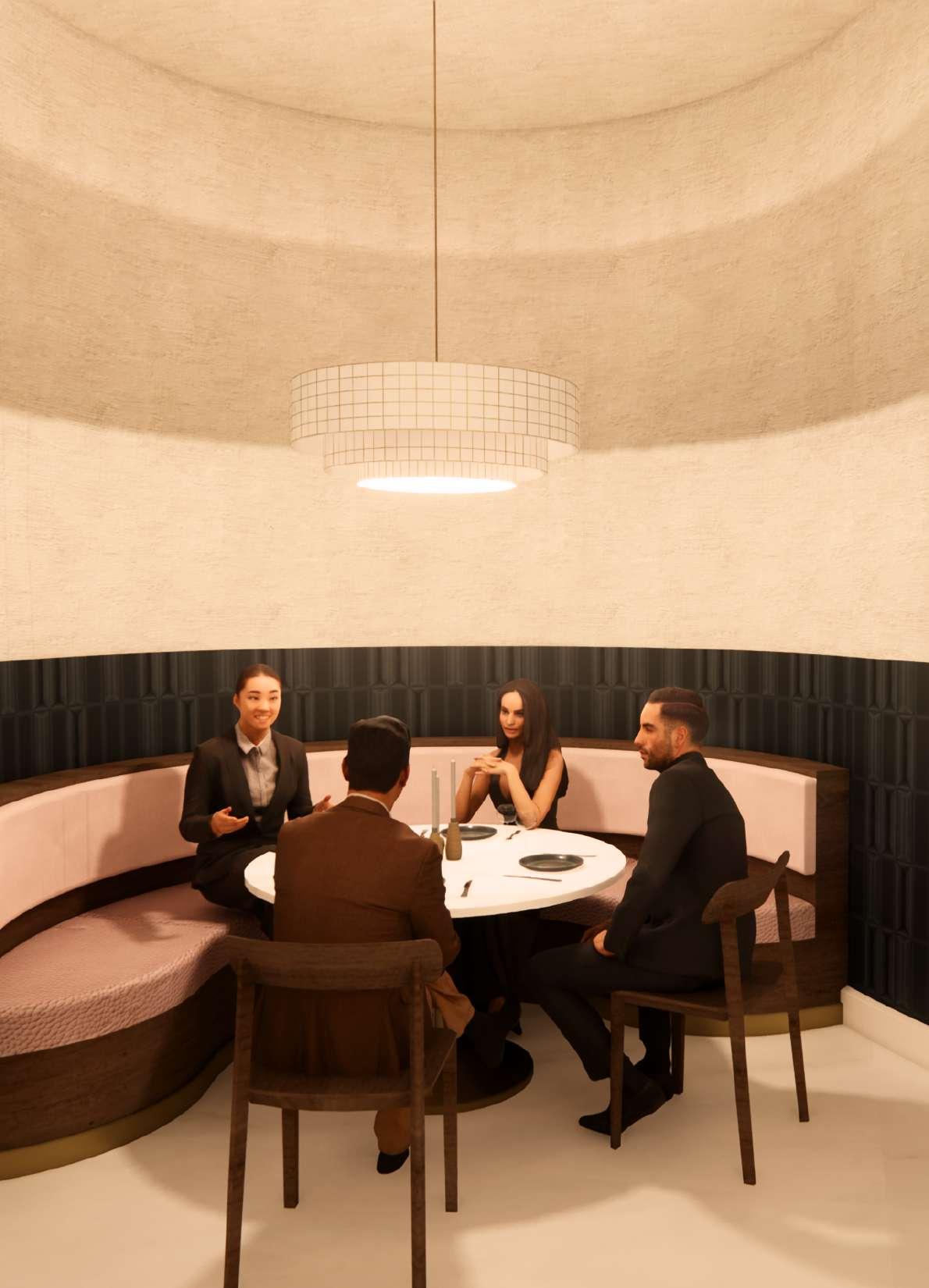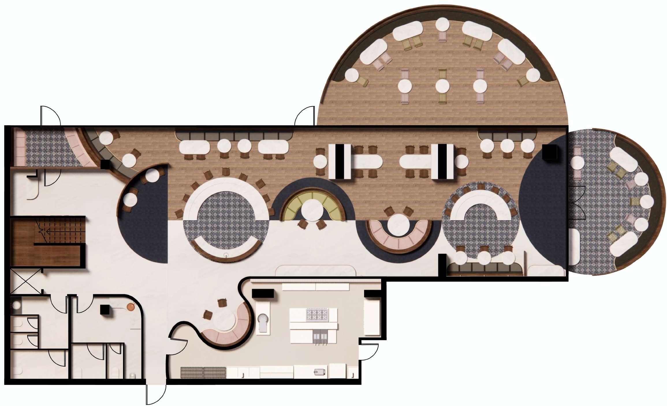 In order to evoke an atmosphere of indulgence I opted to use interesting shapes and lines to entice guests to move further into the restaurant and be immersed in the cuisine and music In order to allow guests to still have privacy but not be completely blocked off from other spaces decorative glass partitions are used around barquettes and at the restaurant's entrance To keep the original ambience of Justine The conceptual drawings and final parti diagram were inspired by the overall feeling of eating delicious, gourmet food while enjoying time with loved ones. Having an array of interlocking spaces that allow guests to feel connected and comfortable I also took great inspiration from Francis D K Ching’s (1979)