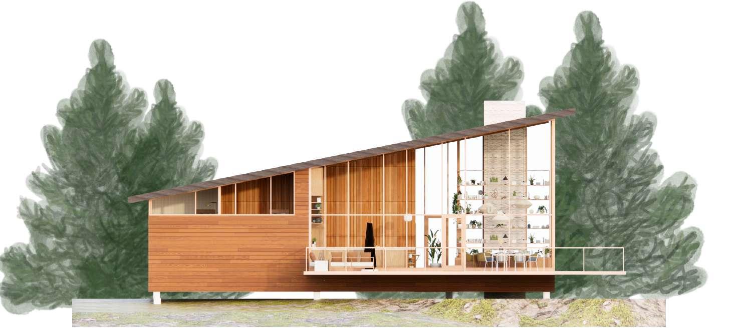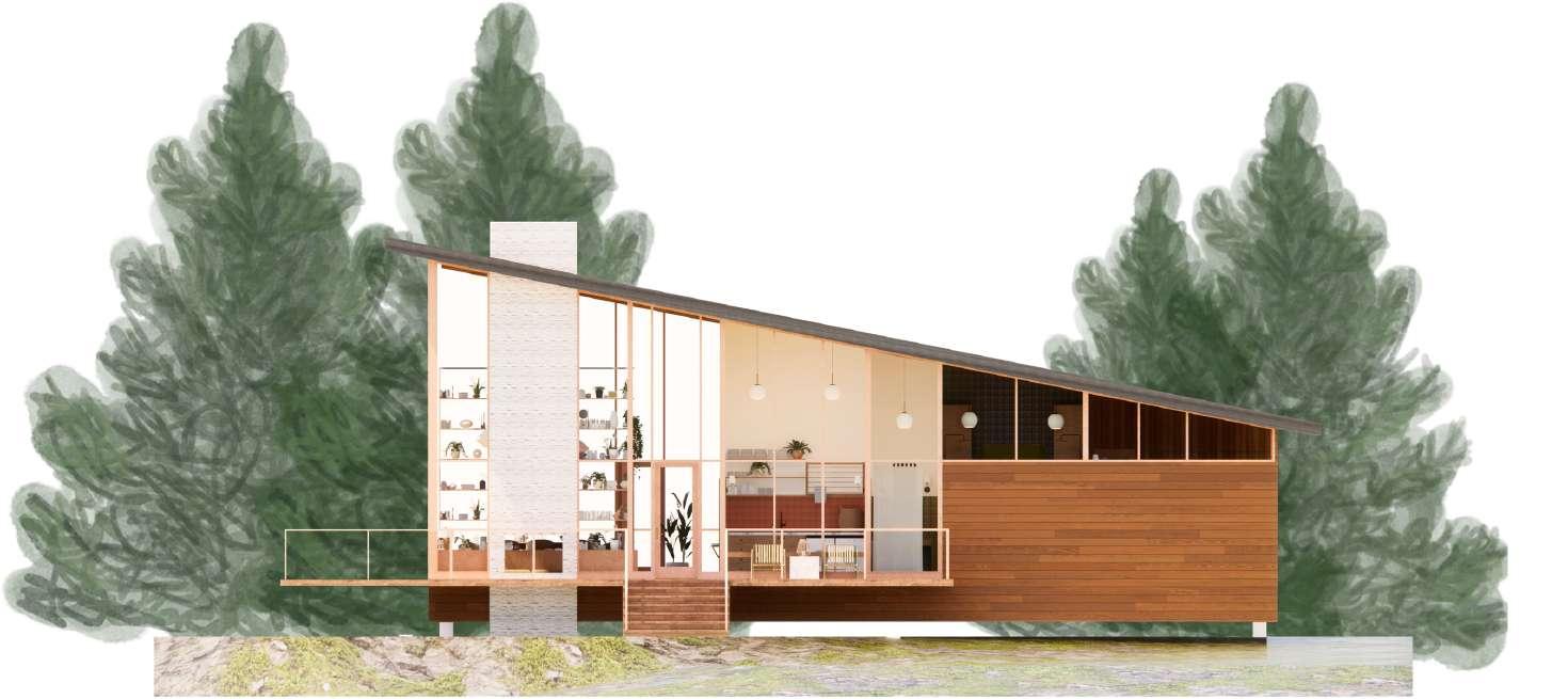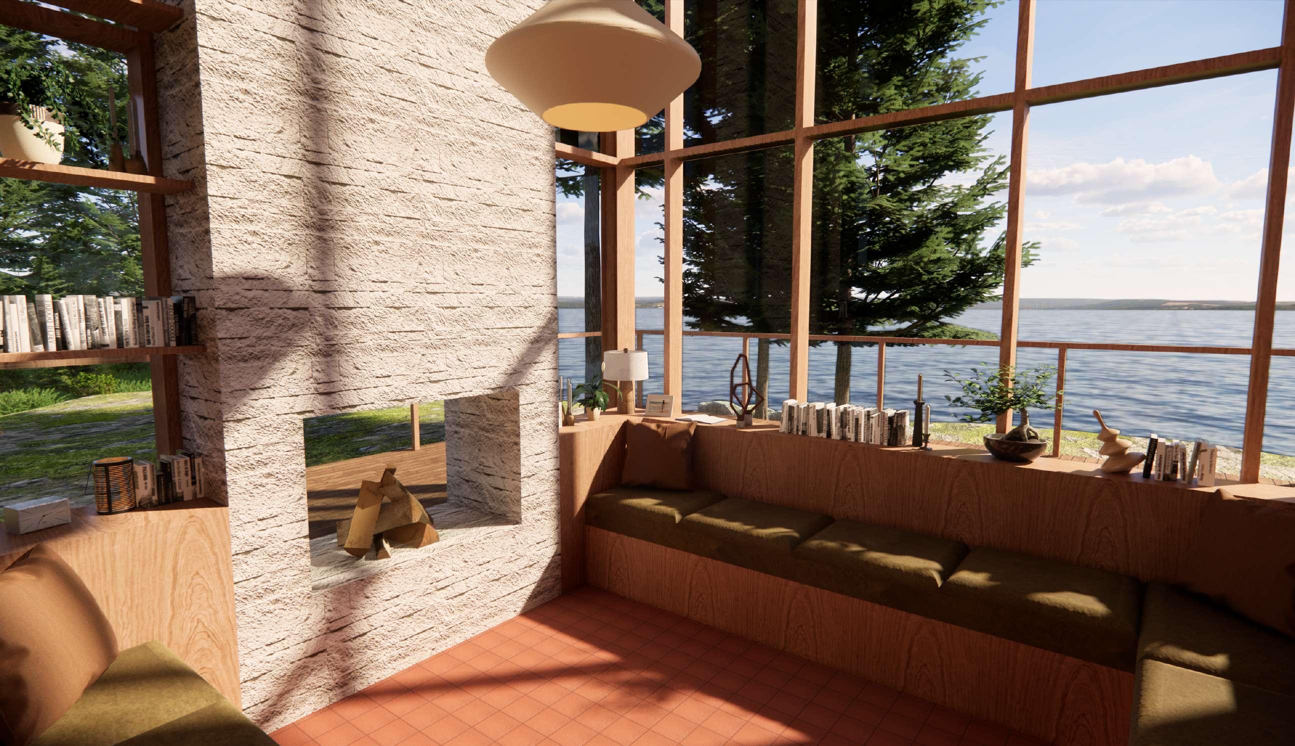 This Georgian Bay cottage was a project that focused on architecture and landscaping by using the site's organic topography and views to articulate the client's needs. The clients of the Georgian Bay cottage consist of a family of three; 2 parents and their son, who spends most weekends at the cottage for work The conceptual approach for the cottages’ design was to create a floor plan that optimized the site’s location, topography views and lighting. Using the site’s different topography as inspiration, I wanted to translate the natural levels into the layout while still having the cottage be generally on one floor. Throughout the entire cottage, there are large, floor-to-ceiling, strategically placed windows that allow for optimal views and lighting. Upon walking into the cottage, through the main entrance, you’re presented with two views; An east-side view through the living room and a south-side view through the dining room.