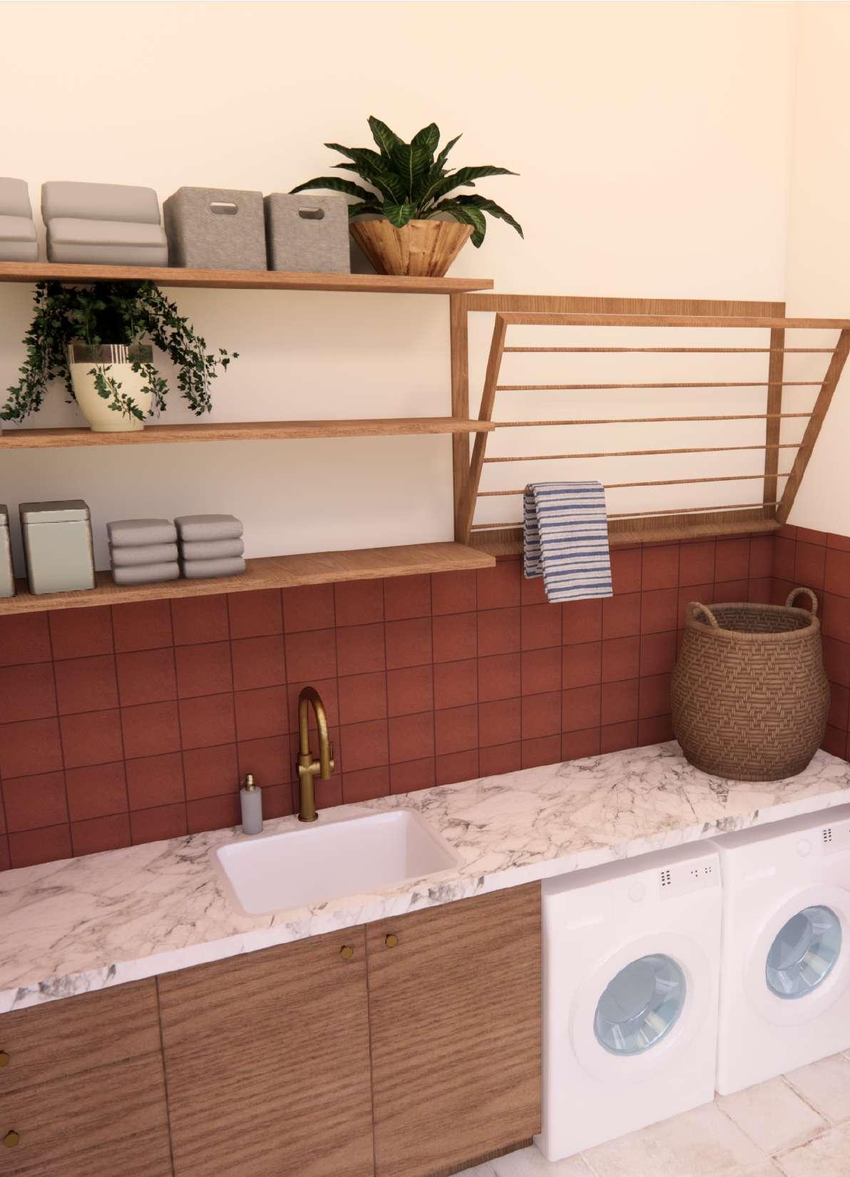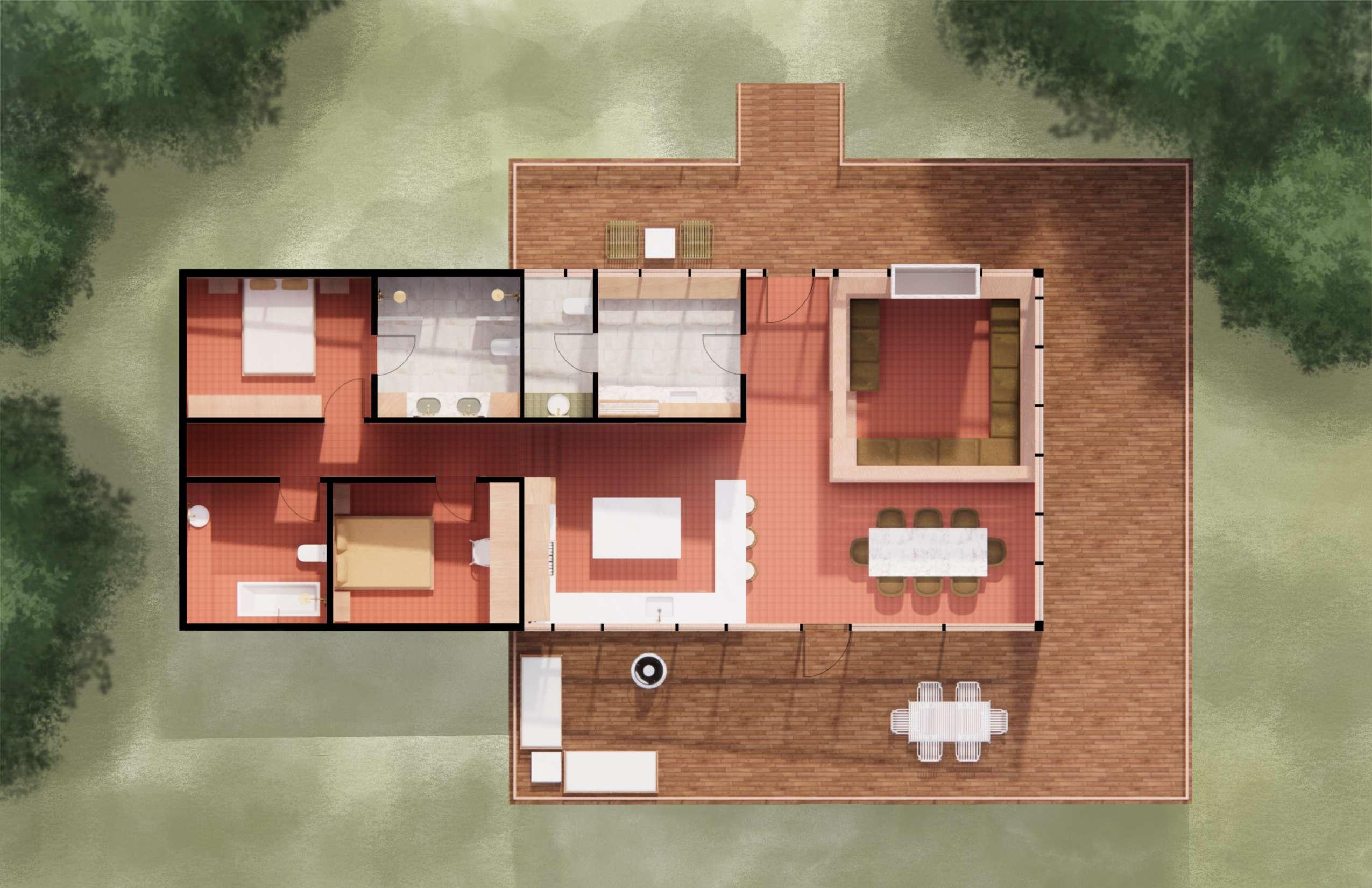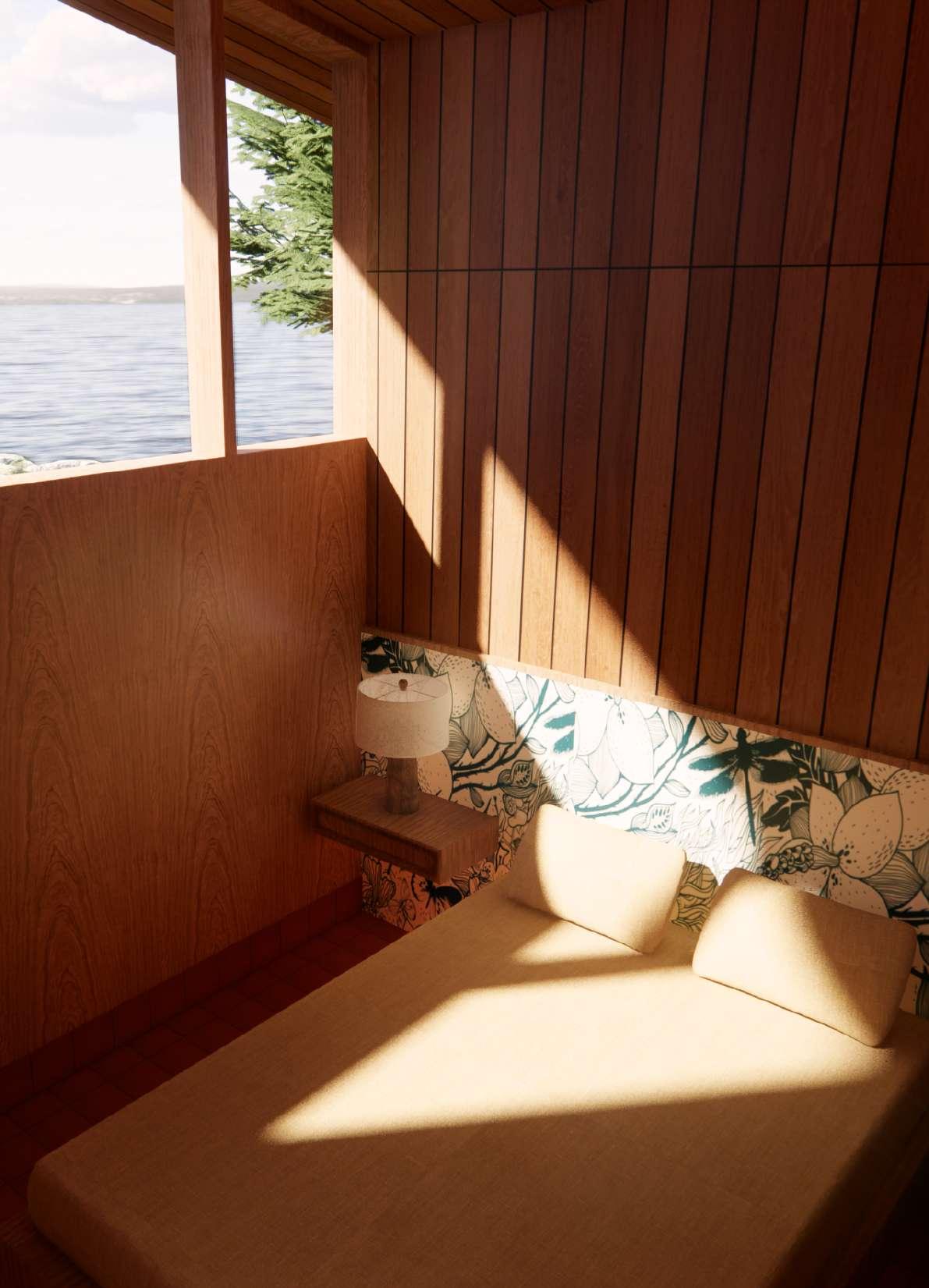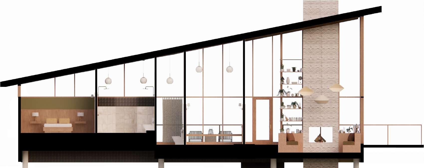 Considering the client's needs and the site orientation the primary bedroom is located facing East so the parents can benefit from sunrises, whereas the guest, or son's bedroom is located facing West so they can benefit from sunsets The overall aesthetic and material palette goals for this project were to reflect where the cottage is located and what surrounds it; I found keeping the materials earthy and natural reflects but contrasts with the topography of rock and rough plant life
