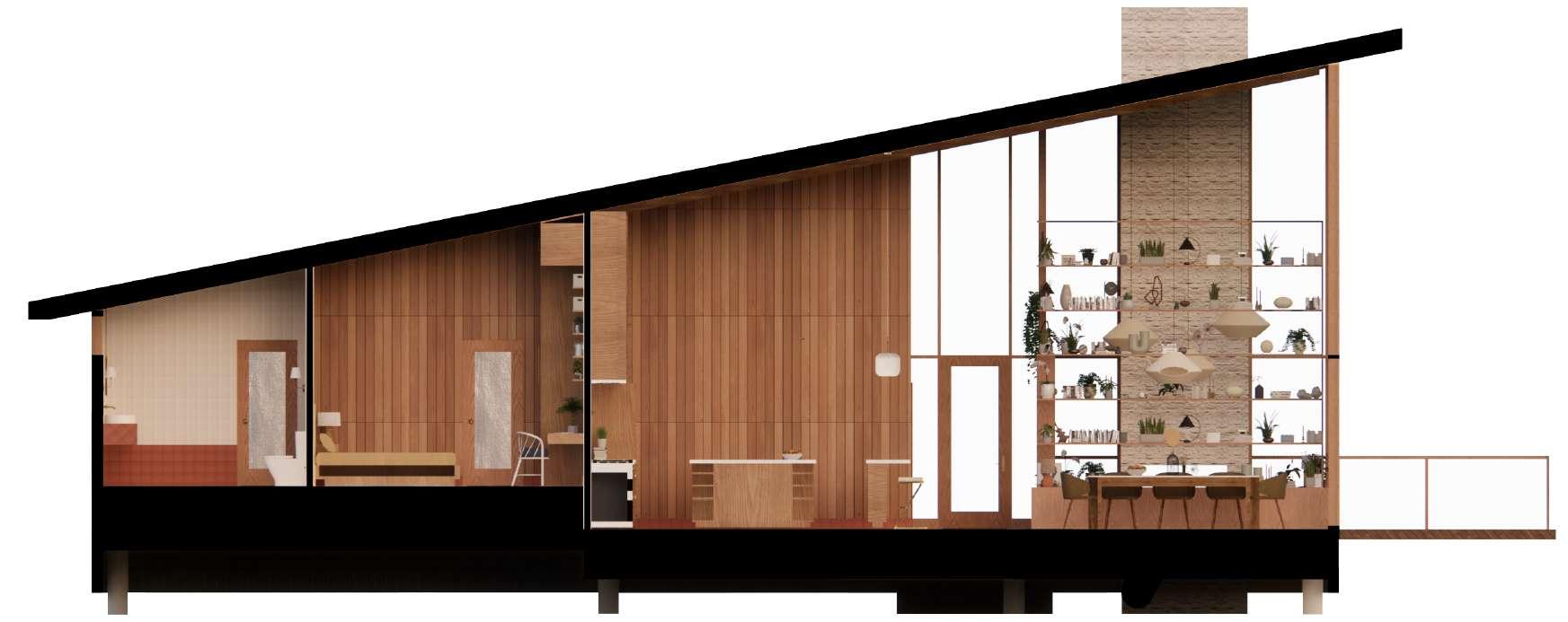 Although the cottage is arranged as one floor, I created different levels throughout the cottage by having a sunken living room (-1 - 6”) and lifting the main sleeping quarters (2 - 0”) to create separation while still having an open concept