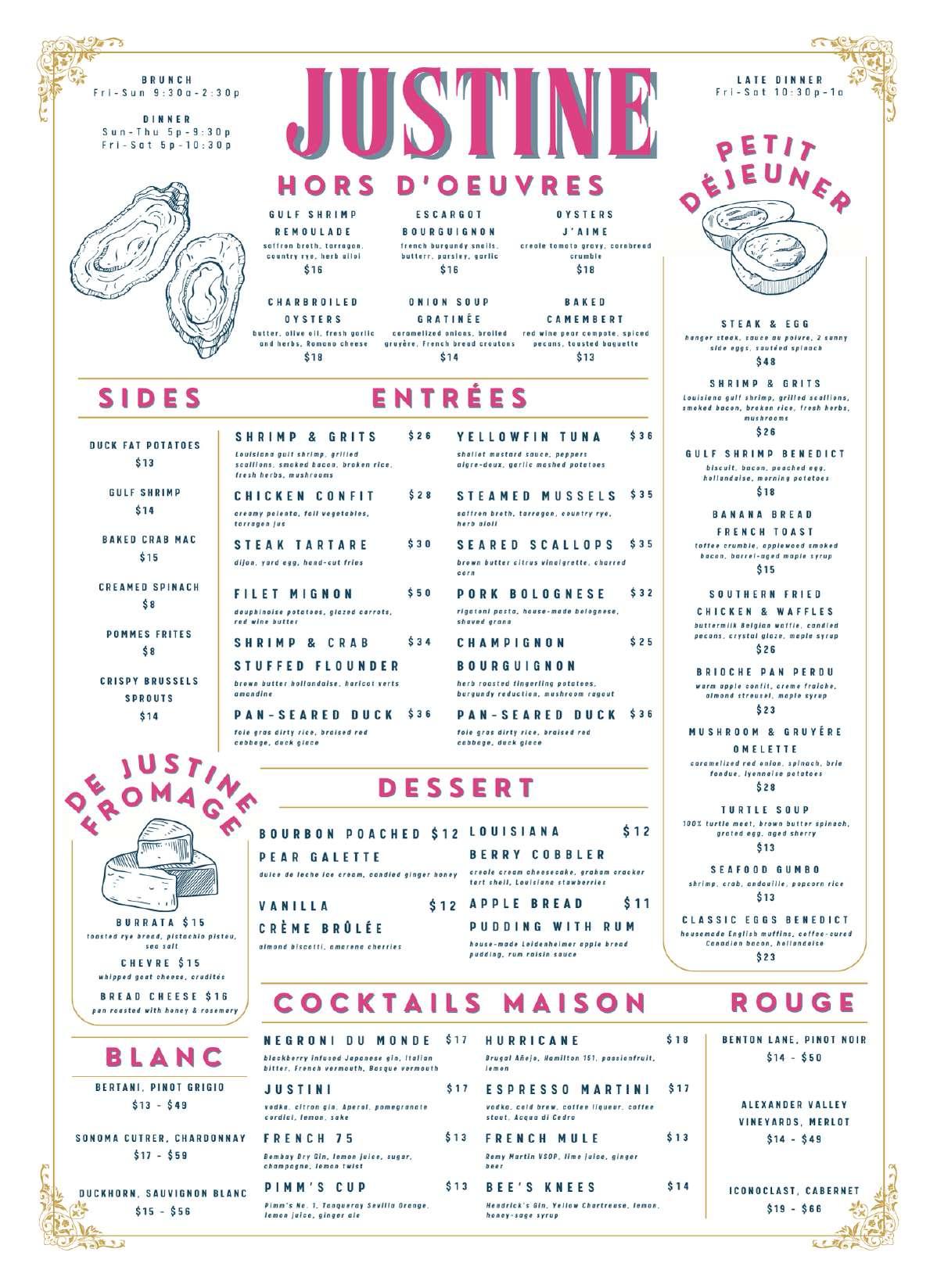 This hospitality project was centred around the New Orleans, French-Creole restaurant, Justine. Justine is a Parisianinspired restaurant in the heart of New Orleans’ historic French Quarter that combines the sophistication of Parisian brasseries with the playfulness of the South s most lively district The concept I developed for Justine was Indulgence, inspired by the overall vision that the owners, Justin and Mia Devillier, wanted to evoke for the new space They wanted to capture the shared celebratory approach that Parisians and New Orleanians reveal in, in regard to their culinary culture, while painting a picture of the interconnected histories that France and New Orleans have. To revel is to take great or intense pleasure or satisfaction in something, which led me to indulgence; Unrestrained gratification of one s own appetite, desires or whims.