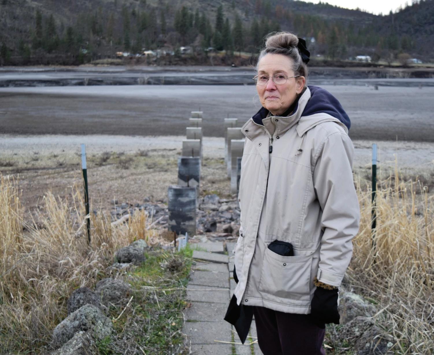 Copco Lake resident Linda Ebert stands where the reservoir has been drained to make way for a flowing Klamath River.