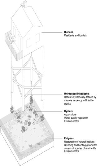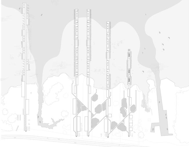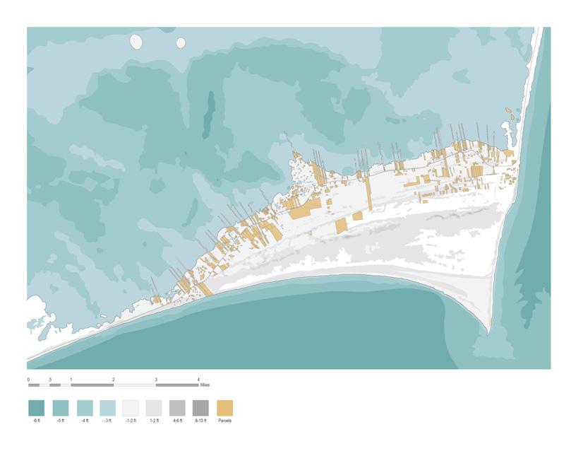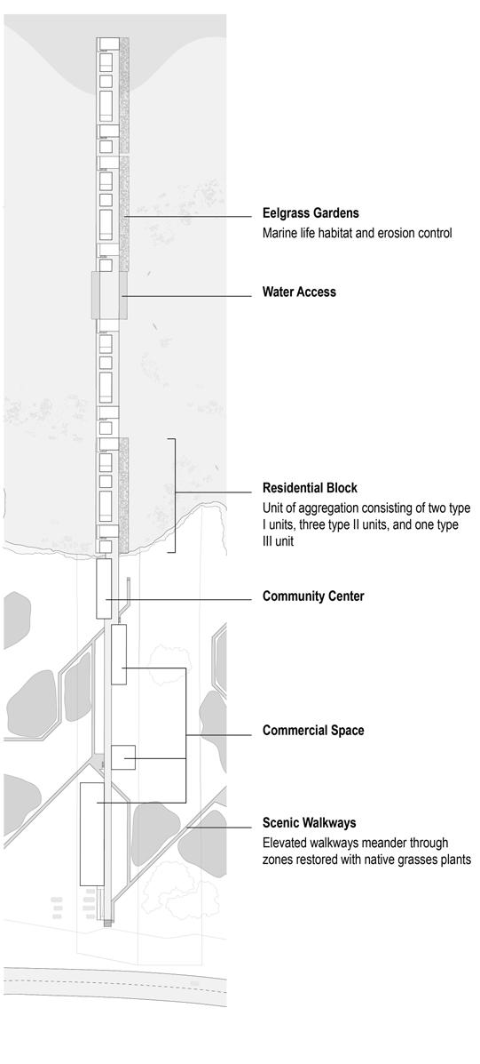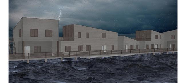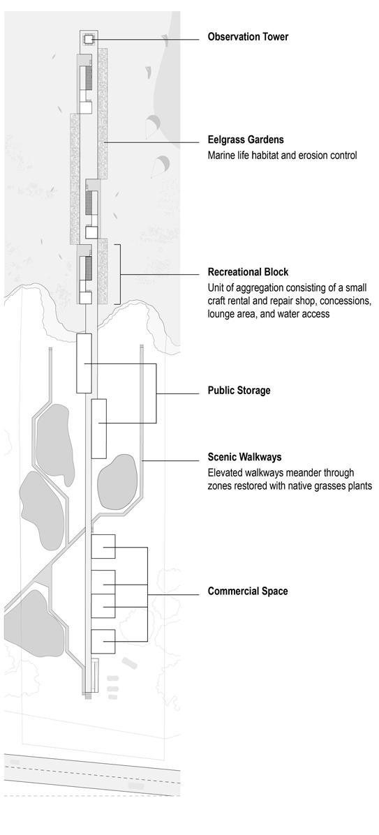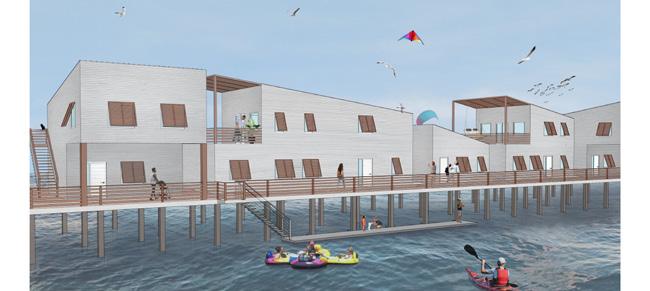 THE OUTER BANKS, LOW-LYING BARRIER ISLANDS CRADLING THE COAST OF NORTH CAROLINA, FACE AN UNCERTAIN FUTURE AT THE MERCY OF RISING SEA LEVELS AND WORSENING STORM EVENTS. THE NEED FOR A SOLUTION TO NOT ONLY PRESERVE THE ECOSYSTEMS AND COMMUNITIES OF THE ISLANDS BUT ALSO THE LARGER BUFFERING EFFECTS THAT PROTECT NORTH CAROLINA’S MAINLAND COAST GROWS MORE URGENT WITH EACH DAY. THIS PROJECT, CREATED AS A FOURTH-YEAR THESIS PROJECT AT THE UNIVERSITY OG VIRGINIA, PROPOSES THE EXTENSION OF PIERS OF VARIED PROGRAMS FROM EXISTING OBLONG PARCELS ON THE SOUND SIDE OF CAPE HATTERAS, BRIDGING THE THRESHOLD BETWEEN LAND AND LAGOON. HEAVY DEVELOPMENT OF THE OCEANFRONT INTERRUPTS IMPORTANT SEDIMENTATION PROCESSES, HINDERING THE DEPOSITION AND ACCUMULATION OF SEDIMENT TO THE SOUND SIDE AND FACILITATING THE EROSION OF BEACHES. ALTERNATIVE METHODS OF CONSTRUCTION AND HABITATION COULD MITIGATE FURTHER HARM TO THE ISLANDS AND LAGOON. THE FIELD OF PILES SUPPORTING THE PIERS AND OTHER EROSION CONTROL TECHNIQUES SUCH AS ENCOURAGING THE GROWTH OF UNDERWATER OYSTER AND EELGRASS FIELDS HAS THE POTENTIAL TO CAPTURE AND HOLD SEDIMENT IN PLACE, COUNTERING UNNATURAL NARROWING OF THE LAND. THE TASK OF PREPARING OUR COASTAL COMMUNITIES FOR A DANGEROUS AND UNPREDICTABLE FUTURE IS A CHALLENGING ONE. THIS PROJECT SERVES TO PROPOSE A SUSTAINABLE ALTERNATIVE TO PRESENT PRACTICES OF COASTAL DEVELOPMENT, ONE THAT TAKES INTO ACCOUNT NOT ONLY THE NEEDS OF HUMANS BUT THAT OF LOCAL ECOLOGIES AS WELL.