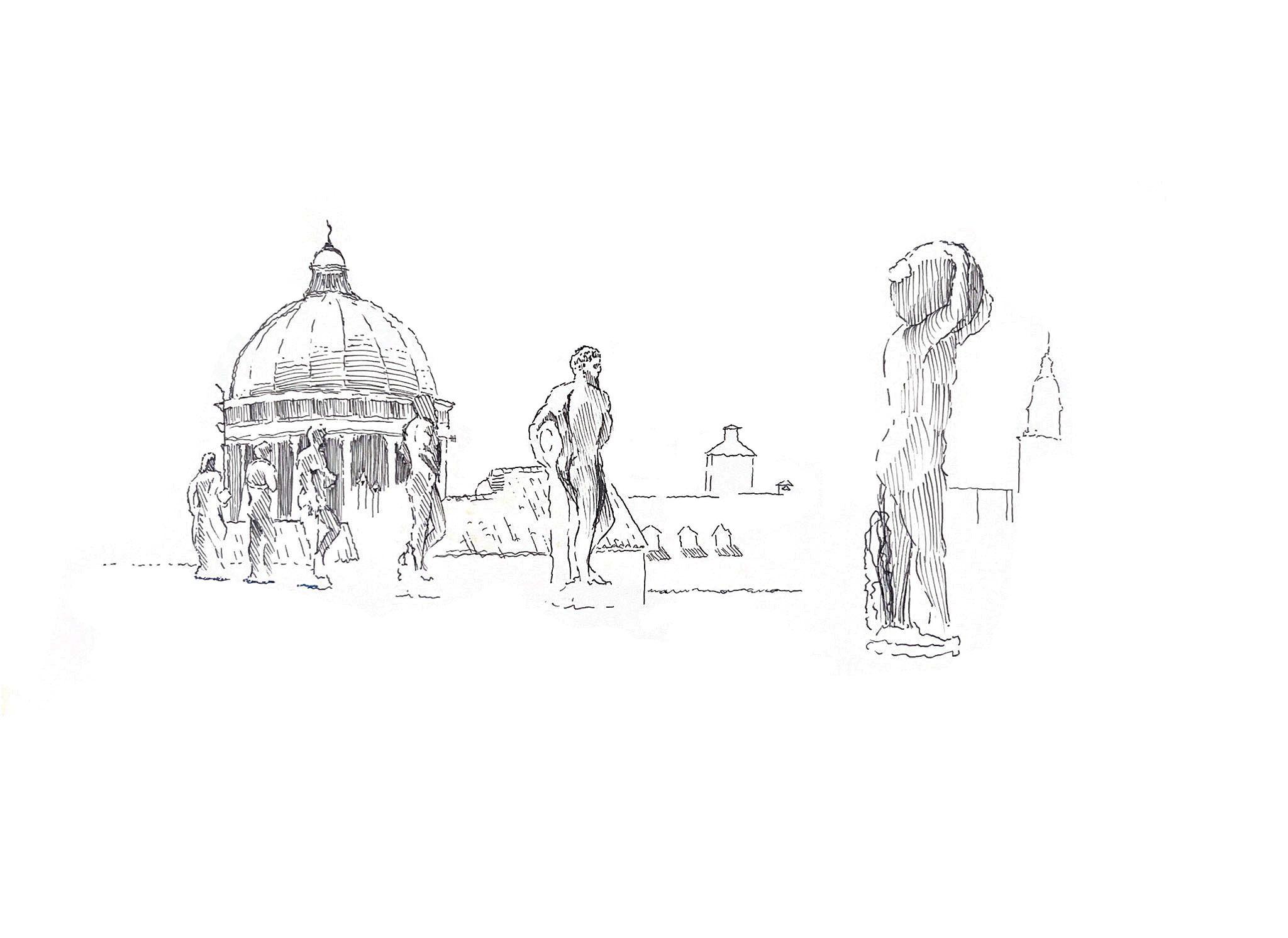 THIS WORK WAS CREATED DURING A SUMMER STUDY ABROAD PROGRAM DIRECTED BY THE UNIVERSITY OF VIRGINIA SCHOOL OF ARCHITECTURE. BASED IN THE CITY OF VICENZA, IN THE VENETO REGION OF ITALY, THIS PROGRAM FOCUSED ON THE ART OF SKETCHING AS A WAY TO BETTER UNDERSTAND BOTH THE BUILT AND NATURAL ENVIRONMENTS. VICENZA IS HOME TO THE VILLA LA ROTUNDA AND OTHER BUILDINGS BY ANDREA PALLADIO, THIS PROXIMITY TO INFLUENTIAL WORKS OF ARCHITECTURE ALLOWED STUDENTS TO PHYSICALLY EXPERIENCE BUILDINGS THAT WERE PREVIOUSLY ONLY KNOWN FROM TEXTBOOKS AND LECTURES. STUDENTS WERE ENCOURAGED TO USE SKETCHING AS A TOOL TO OBSERVE OVERALL SCHEMES AND MINUTE DETAILS WHILE DOCUMENTING, QUESTIONING, AND DRAWING CONNECTIONS BETWEEN OBSERVED QUALITIES. WITH VICENZA AS A HOME BASE ALREADY RICH WITH HISTORIC ARCHITECTURE, PROFESSORS ALSO LED STUDENTS ON DAY TRIPS TO MANY NEIGHBORING LOCATIONS SUCH AS VENICE, MILAN, VERONA, AND MANY OTHERS TO EXPLORE WORKS BY OTHER NOTABLE ARCHITECTS SUCH AS CARLO SCARPA. ASIDE FROM FAMED LOCATIONS, STUDENTS FOUND INSPIRATION IN VERNACULAR ARCHITECTURE AS WELL AS BUSY MARKET SQUARES, GARDENS, AND RIVERS.