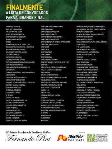 FINALMENTE A LISTA DE CONVOCADOS PARA A GRANDE FINAL AJIR ARTES GRÁFICAS ANTILHAS EMBALAGENS ARO EXP. IMP. IND. E COM. ARTFIX INDÚSTRIA GRÁFICA ARTLASER GRÁFICA E EDITORA AYMORES EMBALAGENS BELTON BIGNARDI IND E COM DE PAPÉIS E ART BRASILGRAFICA SA INDÚSTRIA E COMÉRCIO BRASPOR GRÁFICA E EDITORA BRAZICOLOR INDÚSTRIA GRÁFICA CARTONAGEM HEGA CARTONDRUCK GRÁFICA CHARBEL GRÁFICA E EDITORA CMP COMPANHIA METALGRAPHICA PAULISTA COAN INDÚSTRIA GRÁFICA COMPANHIA DA COR STUDIO GRÁFICO COMUNICARE CONGRAF - INDÚSTRIA E COMÉRCIO GRÁFICA CONSELHEIRO CONTIPLAN INDÚSTRIA GRÁFICA CORGRAF GRÁFICA E EDITORA CORPRINT DA AMAZÔNIA GRÁFICA E EDITORA CORPRINT GRÁFICA E EDITORA DEGRAFICA IMPRESSOS DELTA PUBLICIDADE S/A DI GRÁFICA E EDITORA DP STUDIO EDITORA SÃO MIGUEL EMPRESA FOLHA DA MANHÃ S/A ESCALA 7 EDITORA GRÁFICA ESKENAZI INDÚSTRIA GRÁFICA ETIQUETAS BRASIL FACFORM IMPRESSOS GEO-GRÁFICA E EDITORA GH COMUNICAÇÃO GRÁFICA GRAFDIL IMPRESSOS GRAFFOLUZ EDIT. E IND. GRÁFICA