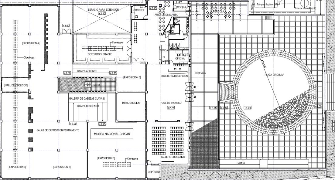 EL MUSEO NACIONAL CHAVÍN DE HUÁNTAR CUENTA CON ESCALERAS Y RAMPAS TENIENDO UNA CIRCULACIÓN ACCESIBLE HACIA EL PUBLICO. LA CIRCULACIÓN DE LOS VISITANTES NO SE INTERRUMPE CON LA CIRCULACIÓN DE LOS TRABAJADORES.