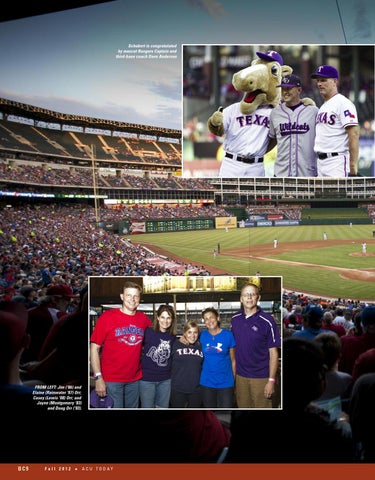 Schubert is congratulated by mascot Rangers Captain and third-base coach Dave Anderson