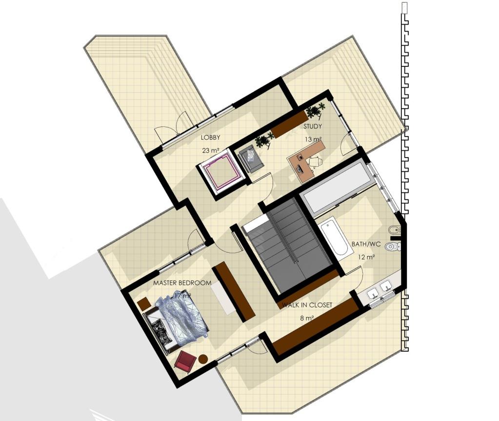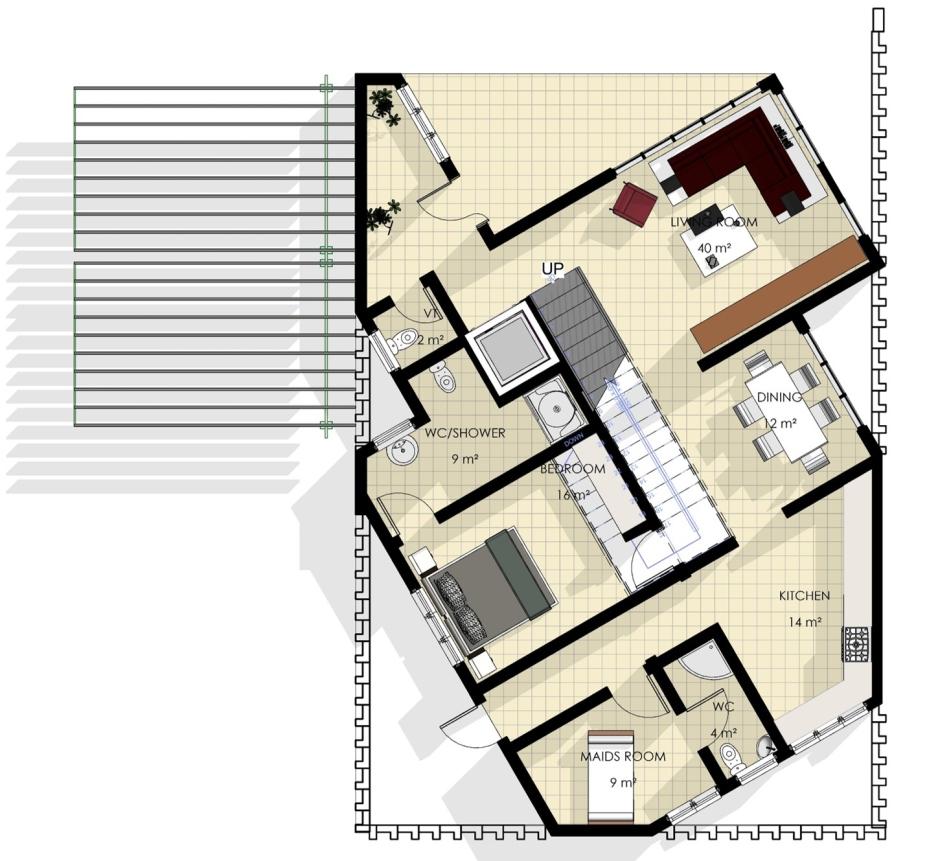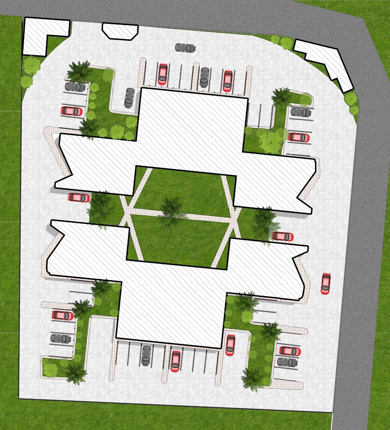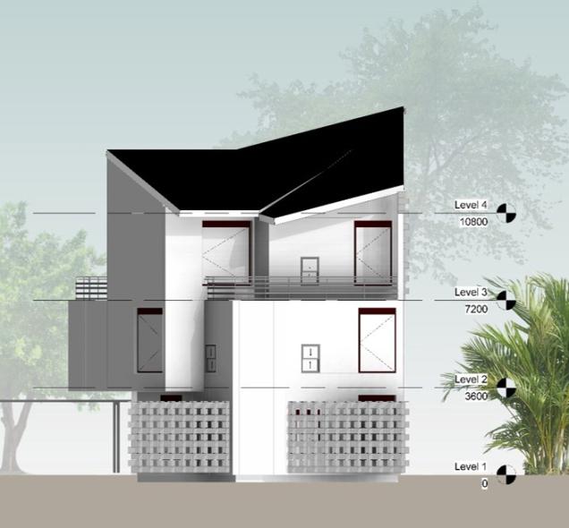 The design adapts a courtyard system with a joint green area which helps to fosters interaction between the the families and create a sense of community. Each unit occupies a total floor area of 4844.7sqft, with each floor being 1615 sqft.
