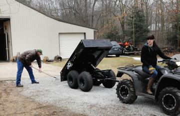 A handlebar-mounted, push-button power dump system provides effortless unloading. Incrementally dump while slowly driving forward to evenly apply gravel to a driveway. The trailer’s bed height, pivot point, and maximum dump pitch are designed to completely dump any payload. A wireless remote option is available.