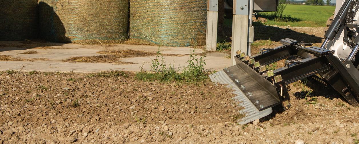 Pull buildup away from the arena rail, wall, or fence with a rail blade that extends to the rail.