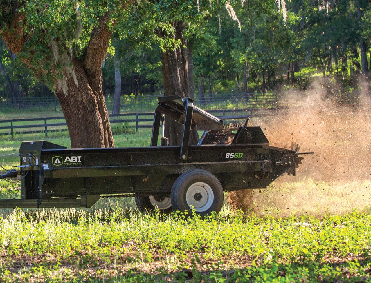 ABI Manure Spreaders employ an industry-exclusive 4-speed manure application flow control, which feeds manure to the rear 2-stage shred and spread system, controlling manure flow to spread evenly on the ground.
