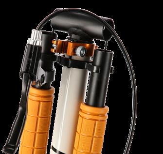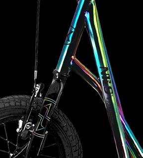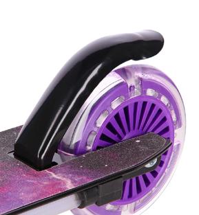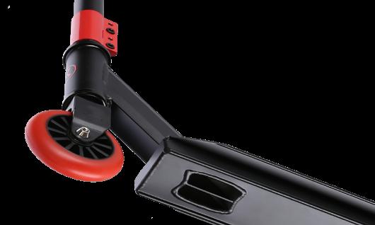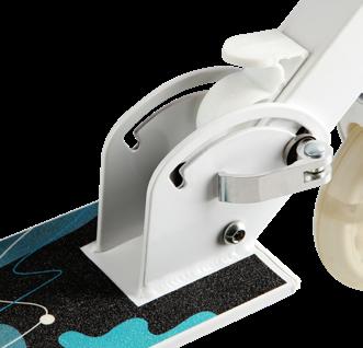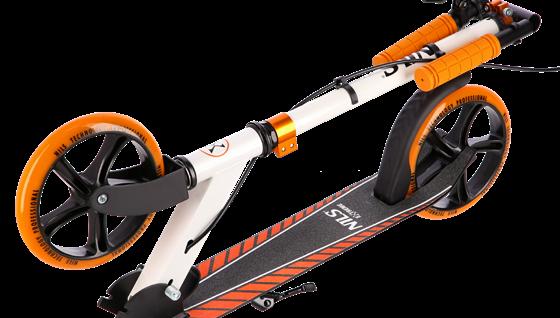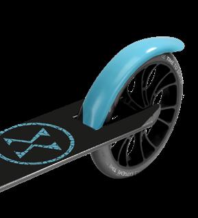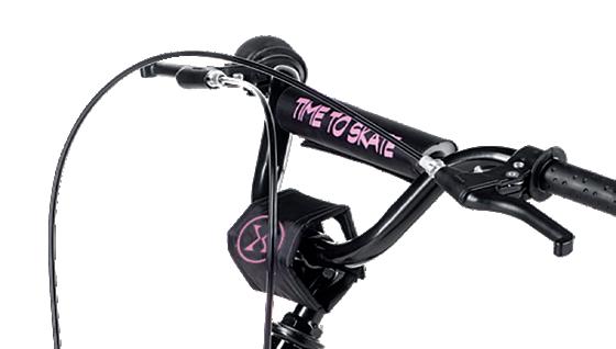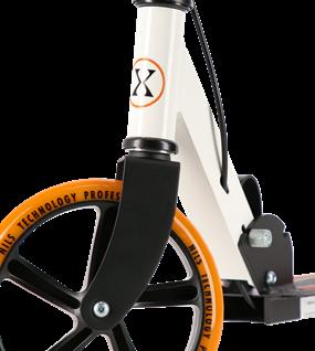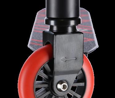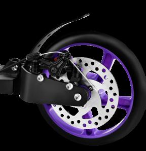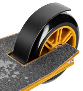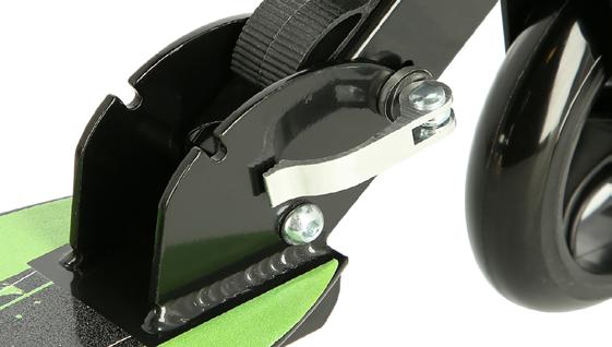 BRAKE – used both in inline skates and scooters. Inline skates, it consists of a brake block and a bracket. Depending on the model, the whole element or only the block are replaceable. In scooters, we distinguish a hand and foot brake. Foot brakes are divided into spring and flexible types. Spring brake is mounted on the attached screw, which is fixed to the deck. The spring on the screw ensures that the brake is turned upwards and tilted from the deck. Flexible fender brake is a long metal plate, which is initially bent to surround the wheel. It is usually mounted by means of one or several screws. Pressing the plate means that the whole brake presses on the wheel. The hand brake can be located by the front or rear wheel. It can be of a disc or shoe type. It is started by means of pressing the handle by the steering wheel.