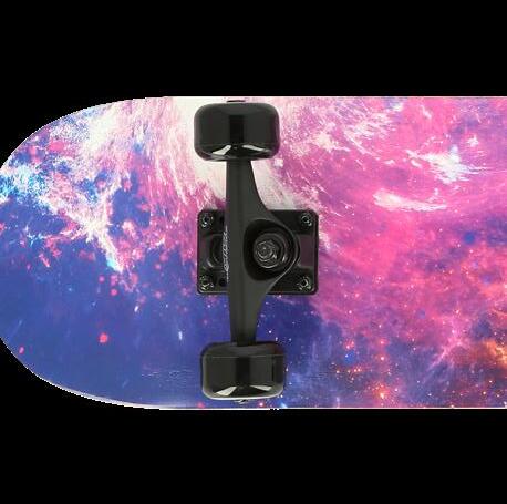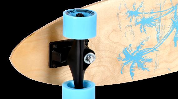 The TRUCK is an element that makes it possible to fix wheels to the board and to control it by shifting your weight to the side you want to turn to. Two metal trucks (aluminium alloy, sometimes with added magnesium, with a steel axle inside) are attached to the deck and then connected to the wheels. The truck consists of two parts – top (baseplate), fixed to the deck, and lower (hanger). Rubber items (bushings) are placed between the baseplate and the hanger. They ensure flexibility when turning on the skateboard. All these component parts are fixed with a screw (king pin). We can change the skateboard rigidity by turning this screw.