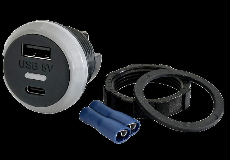 V, 3,6 A.Dubbla uttag 12/24 V max 3,6 A (2,1 A för USB-A och 2,5 A för USB-C). Mått: 37 x 33 mm håltagning 30 mm. Levereras komplett med kabelskor.