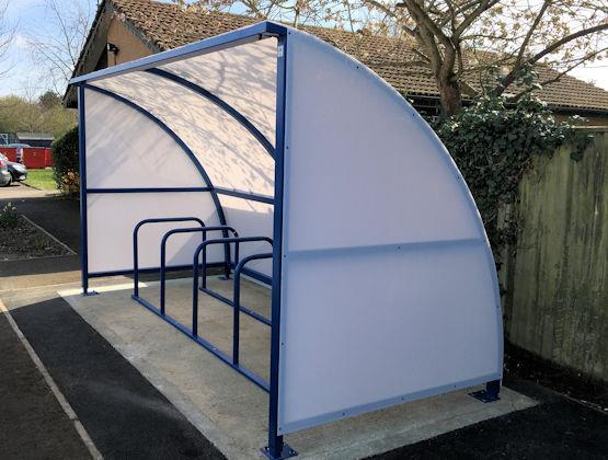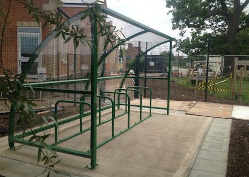 Product: Double Easydale Cycle Shelter & Coniston Wall Mounted Canopy on RSGP; Sizes: Cycle Shelter: 8.2m x 1.7m; Coniston: 14m x 4m; Colour: Cycle Shelter: Moss Green RAL 6005; Coniston: White
